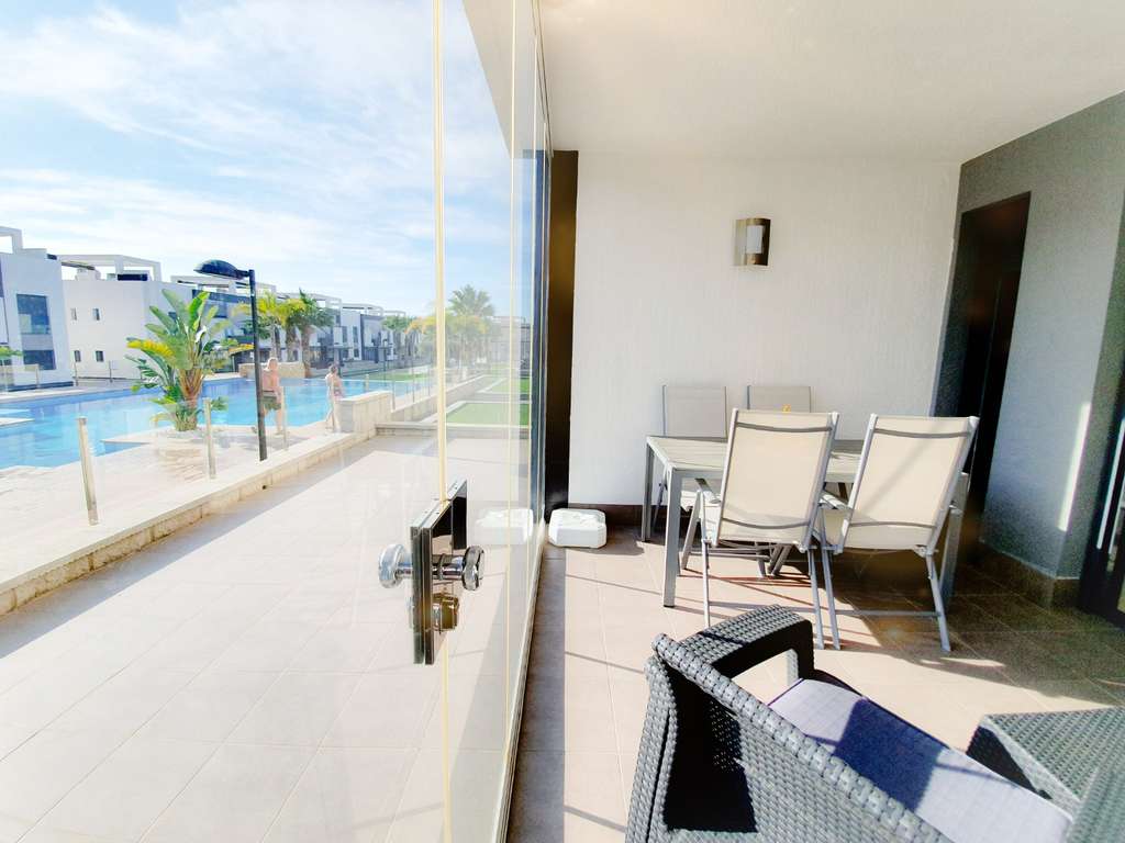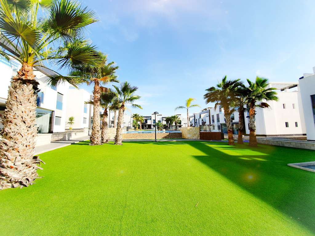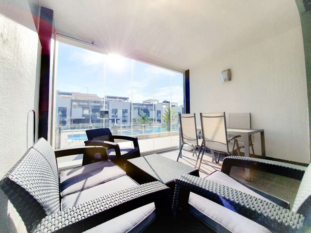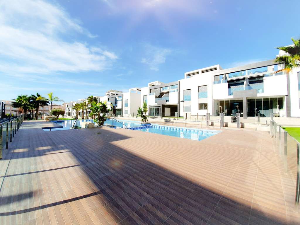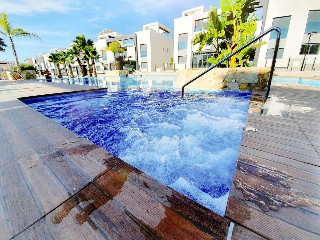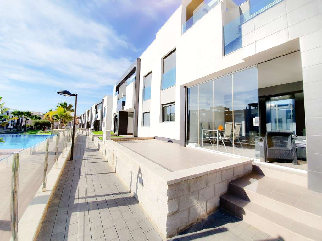 Bungalow en planta baja con un pequeño jardin, terraza acristalada con salida a la piscina, dos dormitorios con armarios empotrados, dos baños completos, unpo de ellos en suite, cocina americana totalmente equipada, salon comedor con salida a la terraza. Residencial con piscina, jacuzzi, zonas ajardinadas, parque infantil y parking. Esta situado en la zona de Los Altos ( Torrevieja), al lado de todo tipo de servicios, hospital, colegios, etc y cerca de la playa de Punta Prima.