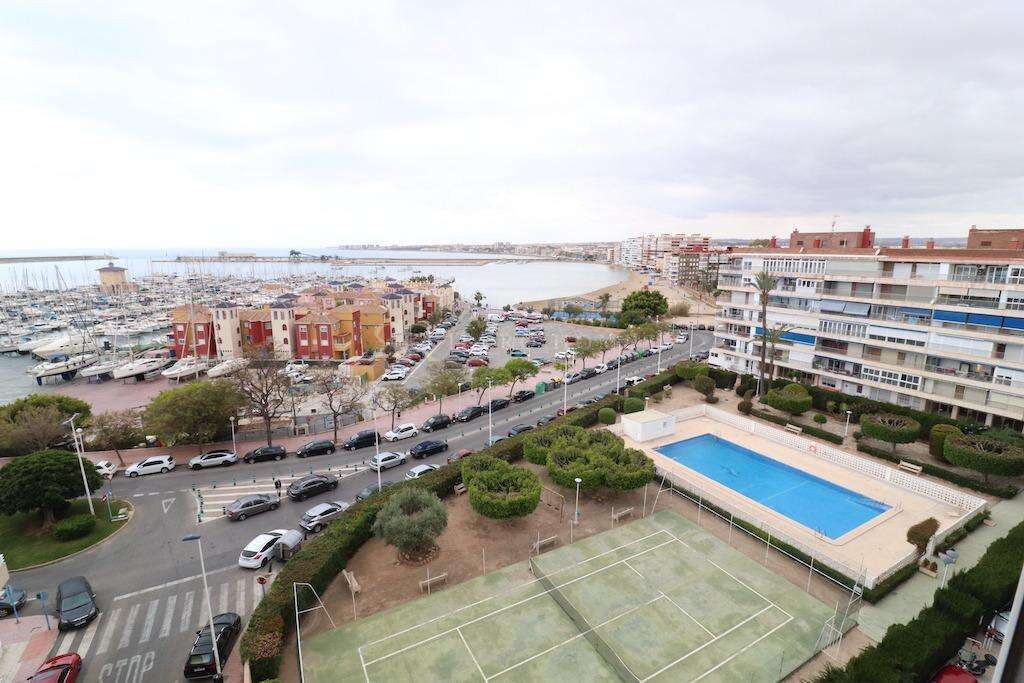 Torrevieja apartamento en esquina en planta septima orientación sur enla Avda Gregorio Marañón frente al puerto deportivo y con vistas estupendas al mar, vivienda de 110 m2 con 2 dormitorios, baño, aseo, cocina grande independiente y amplio salón comedor, la vivienda se vende amueblada, el residencial cuenta con una gran piscina comunitaria y pista de tenis.~~