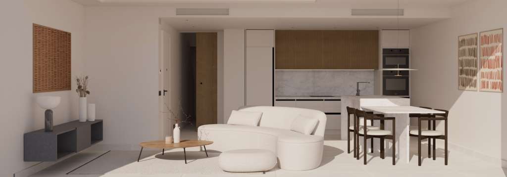 Los espacios habitables serán luminosos, modernos y amueblados funcionalmente. La cocina abierta se conecta perfectamente con el espacio habitable y está diseñada teniendo en cuenta la comodidad y la estética diarias. Cada vivienda está equipada de serie con un sistema de aire acondicionado por conductos totalmente instalado (Mitsubishi MGPEZ-71VJA o similar), que garantiza un clima interior agradable durante todo el año.
