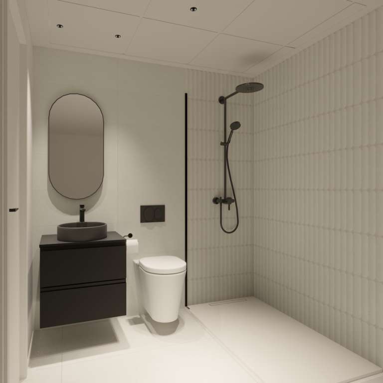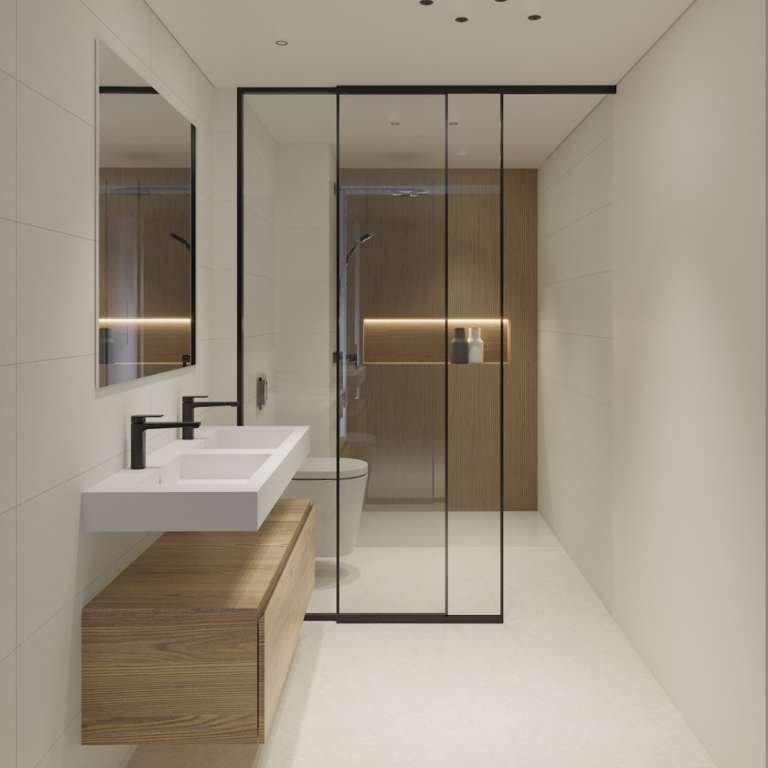 Cada vivienda dispone de dos baños con acabado contemporáneo y de alta calidad. Ambos baños están equipados con platos de ducha antideslizantes con desagüe oculto e inodoros suspendidos para mayor comodidad y un diseño elegante.