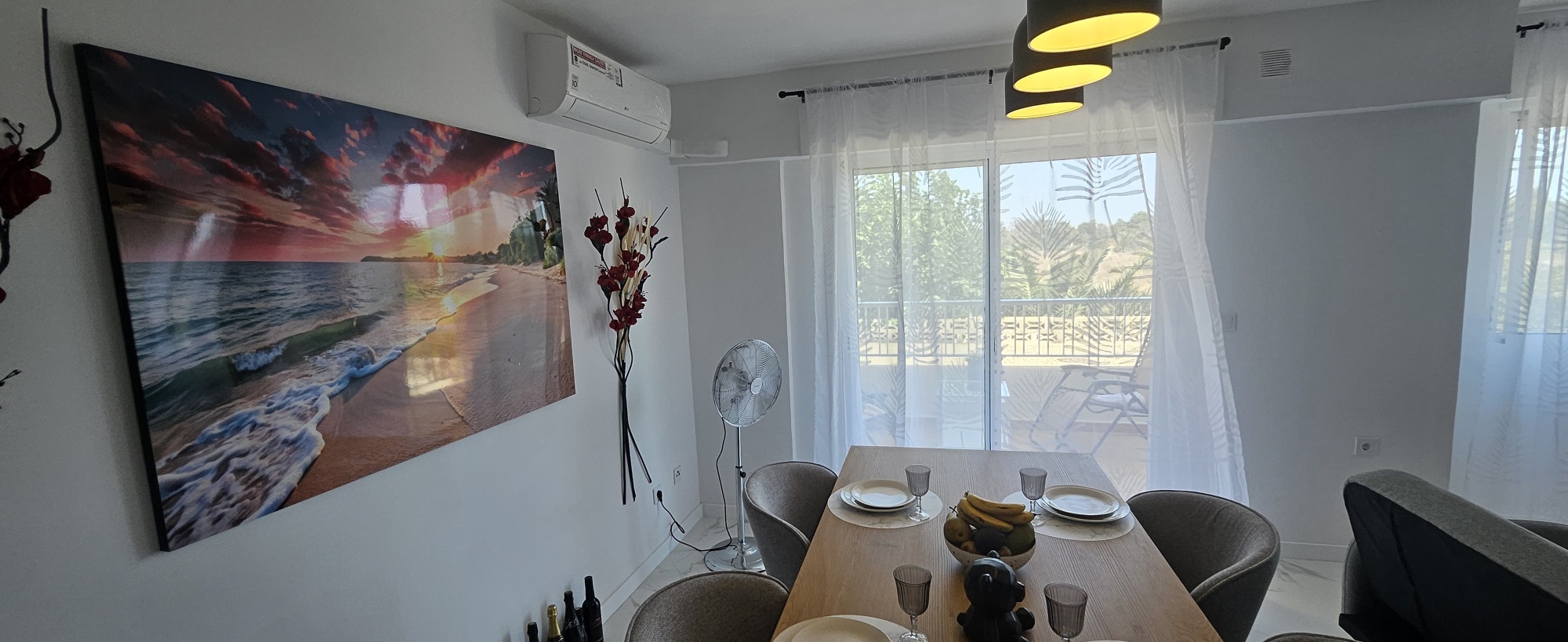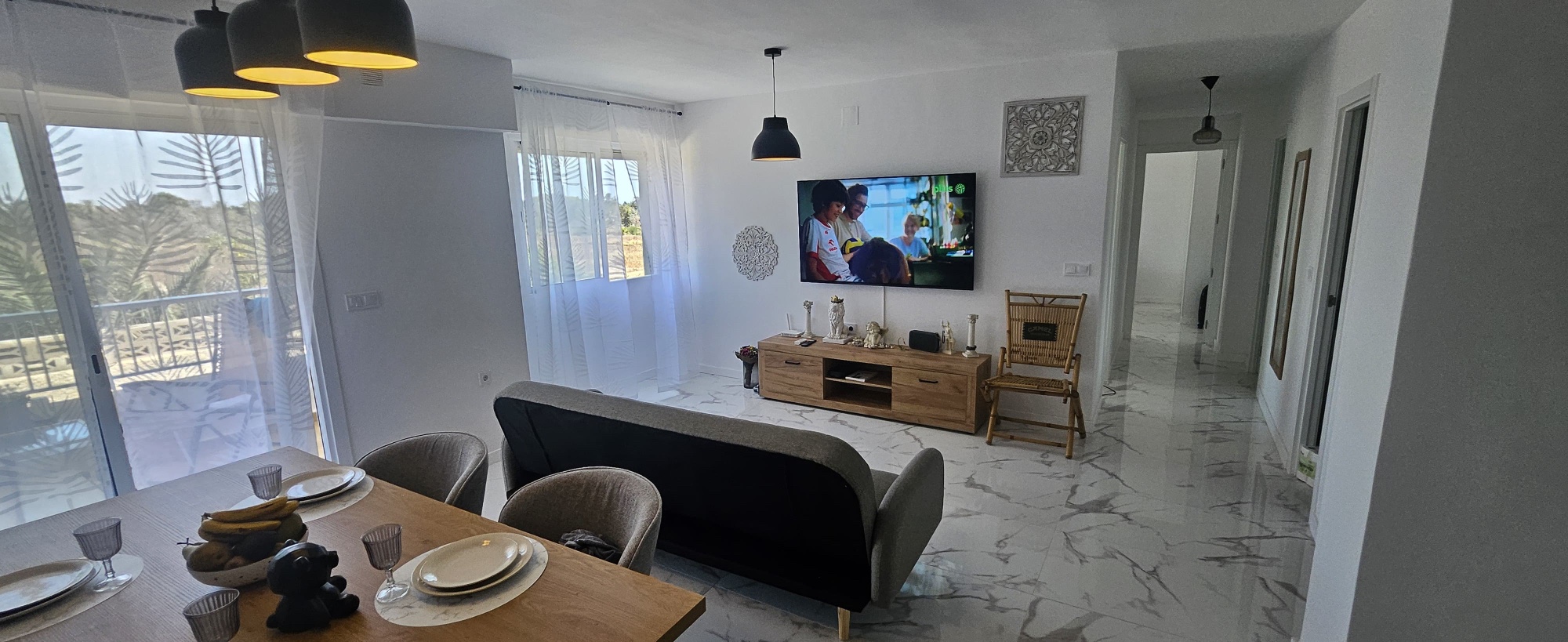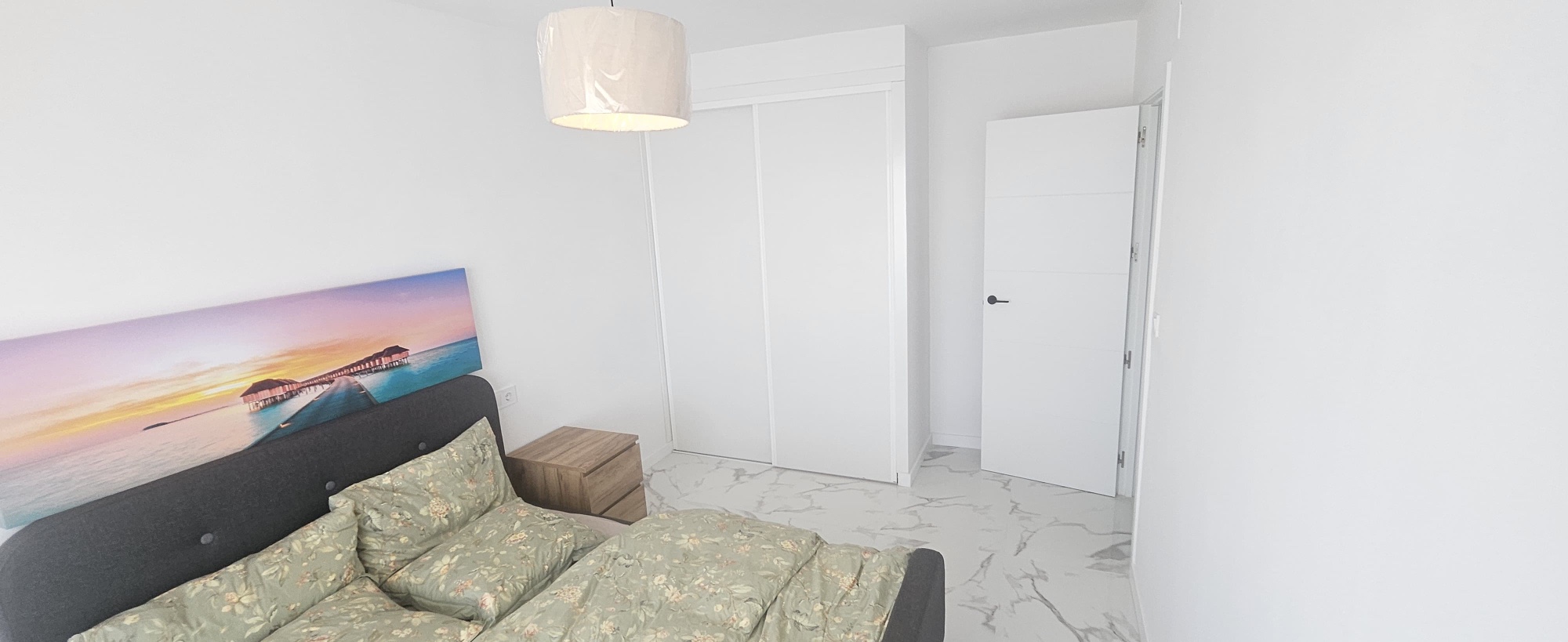 La vivienda cuenta con 95 m² construidos (92 m² útiles) y se distribuye en dos amplios dormitorios, dos baños completos, una cocina moderna integrada en un gran salón luminoso, y dos terrazas orientadas al noreste desde las que se puede disfrutar de vistas al mar. Todos los electrodomésticos son nuevos y cuentan con garantía, al igual que el mobiliario, lo que hace que este apartamento esté listo para entrar a vivir sin necesidad de reformas.