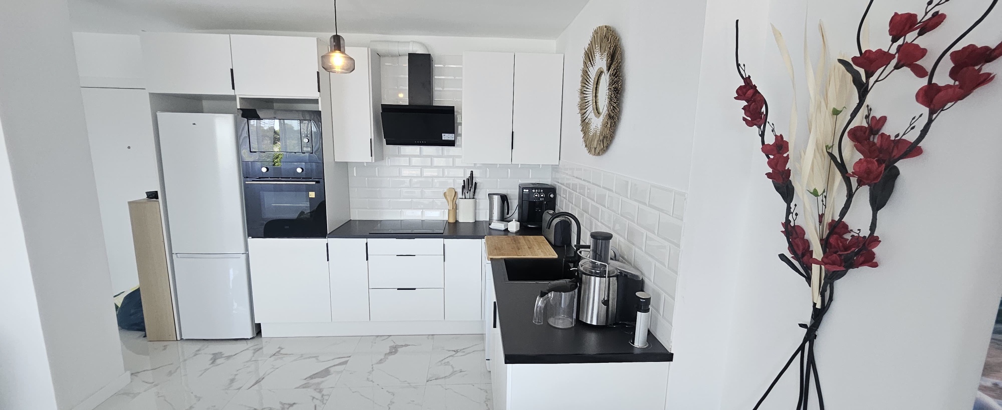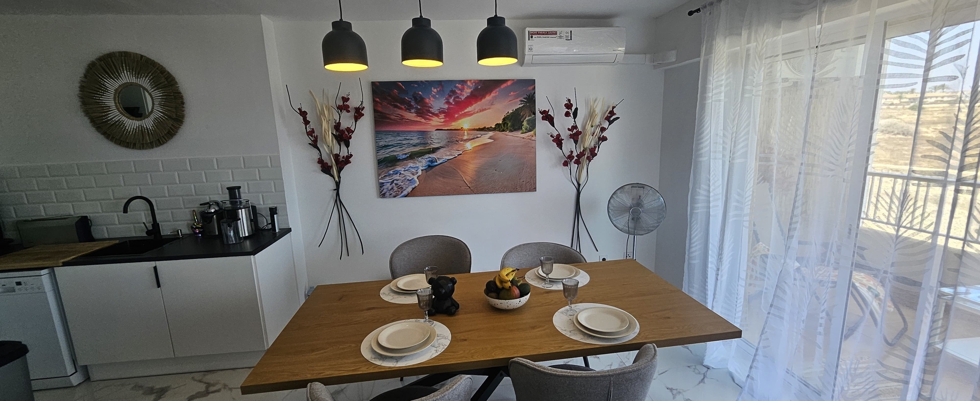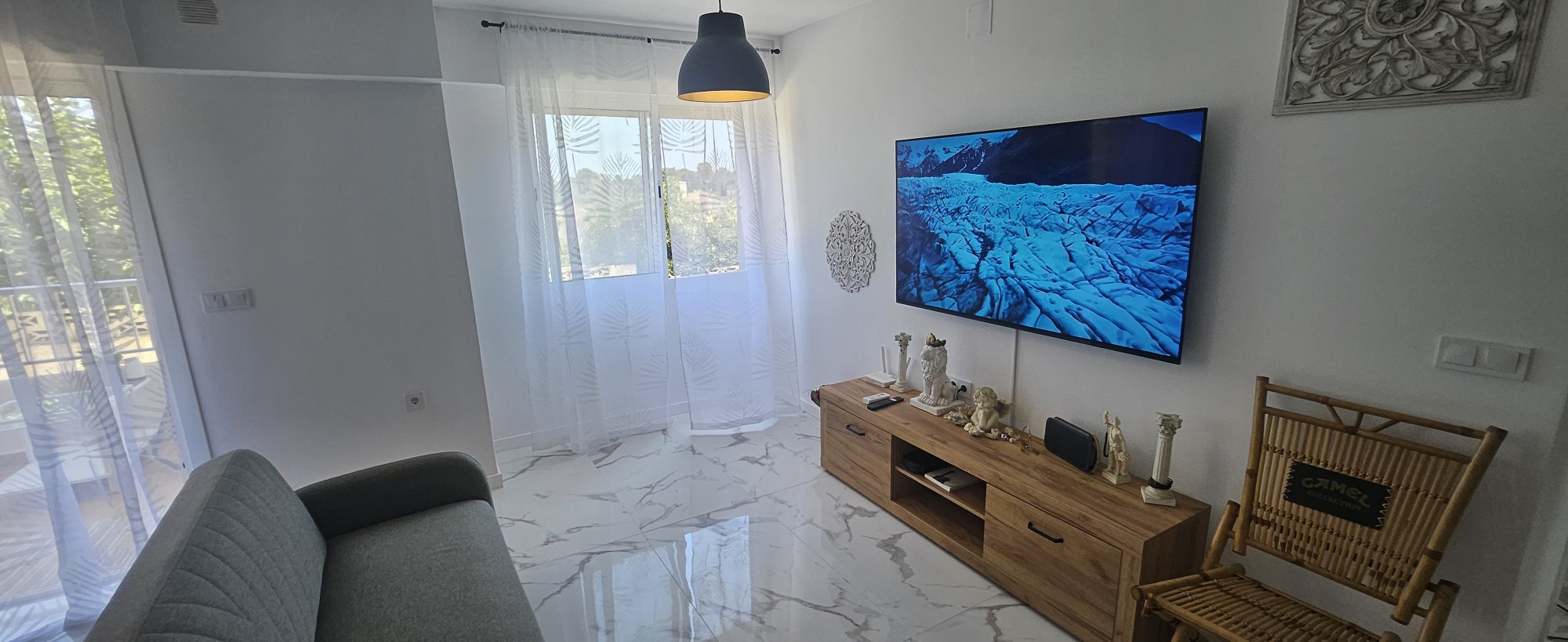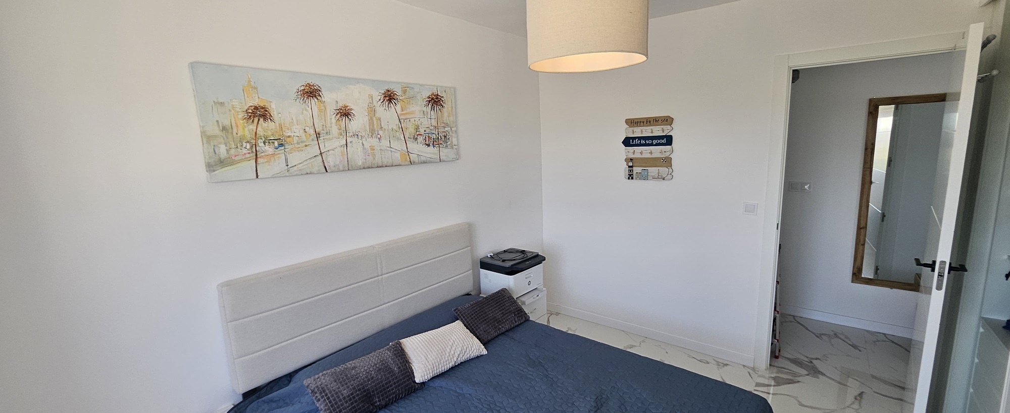 La vivienda cuenta con 95 m² construidos (92 m² útiles) y se distribuye en dos amplios dormitorios, dos baños completos, una cocina moderna integrada en un gran salón luminoso, y dos terrazas orientadas al noreste desde las que se puede disfrutar de vistas al mar. Todos los electrodomésticos son nuevos y cuentan con garantía, al igual que el mobiliario, lo que hace que este apartamento esté listo para entrar a vivir sin necesidad de reformas.