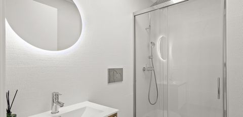 El dormitorio principal cuenta con un baño en suite, mientras que ambos dormitorios exteriores ofrecen encantadoras vistas urbanas. Los dos baños completos están equipados con modernas duchas de diseño, ideales para el máximo confort. La cocina de concepto abierto se integra perfectamente con el espacioso salón, creando un ambiente acogedor y moderno. Desde aquí, se accede a un generoso balcón donde se pueden disfrutar las vibrantes vistas urbanas y la fresca brisa mediterránea.