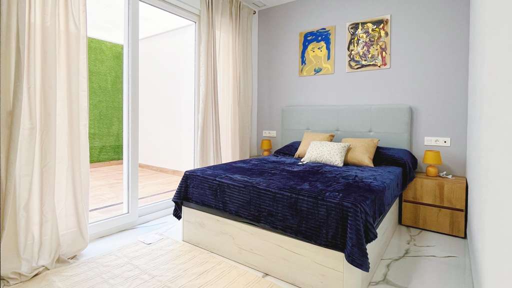 Ubicado en la codiciada Avenida de la Purísima, a solo unos pasos de la Playa del Cura, este elegante apartamento en planta baja ofrece el equilibrio perfecto entre estilo moderno y vida costera. Con 90 m² construidos, la vivienda cuenta con 2 amplios dormitorios, 2 baños de lujo y un encantador patio privado. Ideal como residencia habitual, segunda vivienda o inversión con gran potencial de alquiler. En el interior, ofrece una luminosa zona de estar y comedor con grandes ventanales y acabados modernos. La cocina está equipada con electrodomésticos de alta gama, encimeras negras y mobiliario elegante. Los dormitorios están decorados con armarios empotrados y ropa de cama de calidad. El dormitorio principal tiene acceso directo al patio privado con ducha exterior, pared vegetal y detalles en madera: un espacio tranquilo para relajarse después de la playa. Los baños están acabados con cerámica de alta gama y azulejos efecto mármol, espejos con luz LED y duchas acristaladas. Características principales: 2 dormitorios y 2 bañosPatio privado con ducha exteriorTotalmente amueblado y listo para entrarElectrodomésticos BOSCHSuelos efecto mármol blancoEspejos LED y acabados de diseñoArmarios empotrados y trasteroOrientación este, muy luminosoCalefacción y aire acondicionadoAcceso adaptado para personas con movilidad reducidaRodeado de tiendas, restaurantes y farmacia 24hA solo 100 metros del mar Una oportunidad única de adquirir un apartamento completamente reformado en una de las zonas más demandadas de Torrevieja. Contáctanos para una visita privada.