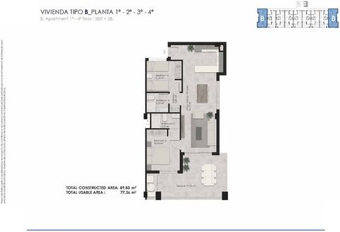 Descripción del objeto: Bonitos apartamentos que constan de una superficie de unos 78 m² - 90 m² (diferentes modelos, incluyendo terrazas) con 2 dormitorios, 2 baños (1 en-suite), 1 salón / comedor con cocina moderna, 1 galería y 1 terraza (a unos 17 m² - 20 m²). Este complejo es el lugar ideal para disfrutar de tu nuevo hogar, viviendas de lujo con un diseño innovador y cuidado, pensadas para el cliente, con una ubicación privilegiada para poder disfrutar de los mejores servicios. Se encuentra a escasos 700 metros de la playa de La Mata y muy cerca de un centro comercial con variedad de comercios y un gran supermercado. Compuesto por un total de 362 viviendas - apartamentos y áticos de lujo con 2 o 3 dormitorios y 2 baños. Desde el primer piso, todas las viviendas disfrutan de una terraza con espectaculares vistas al Mar Mediterráneo. Las plantas bajas disfrutarán de jardín privado, los áticos tendrán un amplio solárium privado con vistas panorámicas al mar y a los alrededores. El residencial privado, totalmente vallado, dispondrá de zonas de césped y jardines mediterráneos, dos piscinas para adultos y otra infantil, zonas deportivas y zona de aparcamiento para vehículos y bicicletas. Equipamiento adicional: Las viviendas incluyen entre otras cosas preinstalación de aire acondicionado, persianas eléctricas, iluminación en los dos baños y cocina, muebles empotrados forrados, aerotermia y un plaza de aparcamiento en superficie. Ubicación de casa/solar: Los apartamentos de esta urbanización se encuentran sólo a unos 700 metros de la hermosa playa de arena de La Mata y la mayoría de las viviendas ofrece unas muy bonitas vistas al mar. La urbanización está rodeada de todo tipo de servicios abiertos durante todo el año. En las inmediaciones encontramos supermercados, bancos, farmacias y restaurantes. Junto a la promoción hay una parada de bus y taxis. Además hay en Torrevieja también dos hospitales modernos y un atractivo puerto deportivo y un bello paseo marítimo. Con su variada oferta deportiva y su situación junto al mar, Torrevieja ofrece todo lo necesario para pasar unas vacaciones de ensueño. En los alrededores se encuentran varios campos de golf y el aeropuerto de Alicante está alcanzable en poco tiempo.