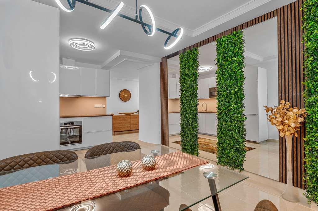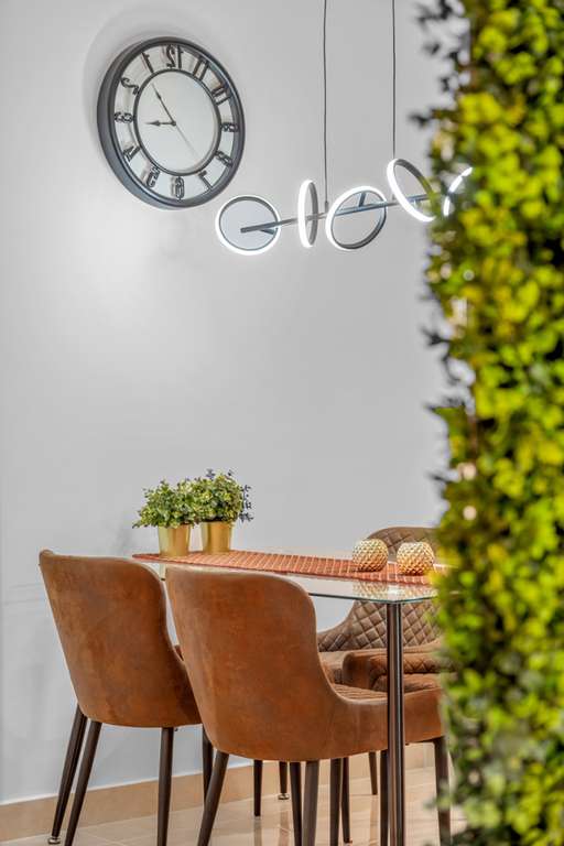 El interior está decorado en un estilo moderno y minimalista, combinando la elegancia del blanco con la calidez de la madera y el toque natural de las plantas. Se vende parcialmente amueblado, tal como se muestra en las fotos, dejando espacio para que el nuevo propietario personalice el ambiente a su gusto.