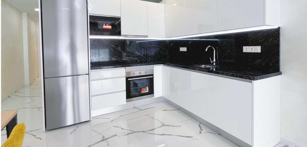 En el interior, ofrece una luminosa zona de estar y comedor con grandes ventanales y acabados modernos. La cocina está equipada con electrodomésticos de alta gama, encimeras negras y mobiliario elegante.