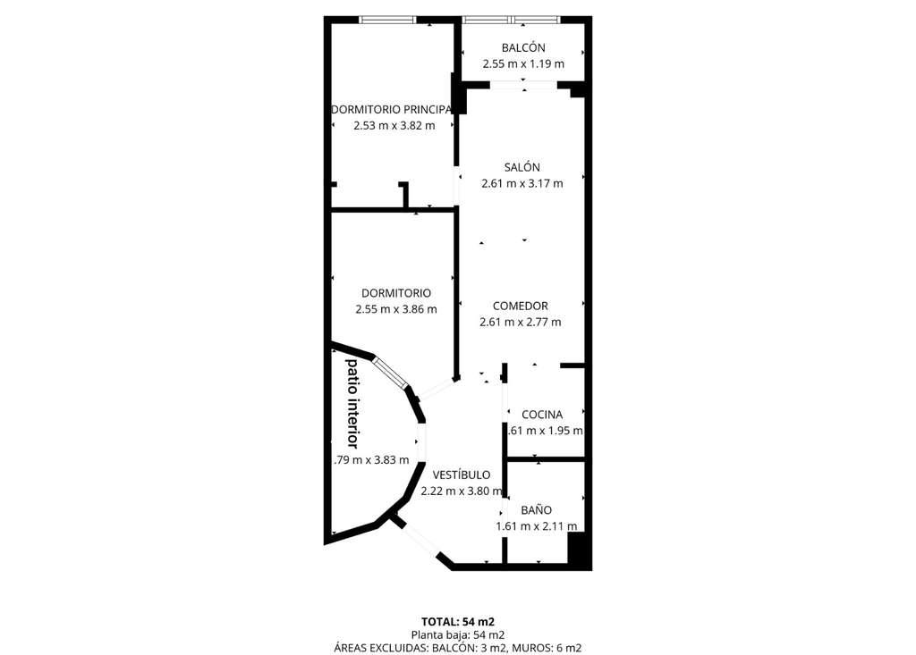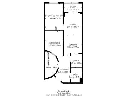 El apartamento cuenta con una superficie construida de 49,3 m². A esta superficie se suman un patio interior de más de 6 m² y un balcón de aproximadamente 3 m², espacios exteriores ideales para disfrutar del clima mediterráneo durante todo el año.