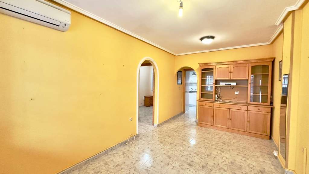 Se trata de una acogedora planta baja de estilo mediterráneo situada en una de las zonas más demandadas de Torrevieja, perfecta tanto para vivir todo el año como para disfrutar de largas estancias de vacaciones junto al mar. Desde el primer momento transmite una sensación de tranquilidad y comodidad, con espacios pensados para el descanso, la convivencia y el disfrute del clima suave característico de la Costa Blanca. La vivienda se integra en un entorno residencial donde prima el ambiente familiar, las zonas de descanso y la cercanía a todo tipo de servicios, sin renunciar a la paz que se respira en las calles interiores lejos del bullicio del centro. Nada más llegar al residencial, el visitante se encuentra con un conjunto perfectamente cuidado, con accesos cómodos y rutas peatonales que invitan a pasear a cualquier hora del día. El sonido lejano de las conversaciones en las zonas comunes y el suave murmullo del agua de la piscina crean un telón de fondo relajante que acompaña cada paso. El edificio se presenta armonioso, con una estética actual y limpia que combina tonos claros y detalles en materiales duraderos, pensados para resistir el paso del tiempo y el ambiente marino típico de Torrevieja. Al entrar en la vivienda, el recibidor se abre de forma fluida hacia la zona de día, generando una primera impresión de amplitud y calidez. La luz natural entra generosa desde la parte exterior, llenando el espacio principal y realzando los tonos suaves de paredes y suelos, lo que ayuda a crear una atmósfera serena. Este primer ambiente resulta ideal para dar la bienvenida a familiares y amigos, ya que permite una circulación cómoda y una distribución intuitiva entre la parte social y la parte más privada de la casa. La terraza se convierte en el corazón de la vivienda, el lugar donde más se disfruta del estilo de vida mediterráneo. Es un espacio perfecto para colocar una mesa con varias sillas y crear un pequeño comedor exterior donde desayunar al aire libre, compartir comidas largas durante los meses de buen tiempo o simplemente relajarse con un café al final del día. Desde esta zona exterior se percibe la vida del residencial, el murmullo ligero de los vecinos y, en ciertos momentos, la alegría de la actividad en la piscina comunitaria, siempre a una distancia cómoda que garantiza tanto el ambiente como la privacidad. Durante el día, la terraza se llena de luz, convirtiéndose en un rincón ideal para quienes disfrutan leyendo, trabajando con un portátil o tomando el sol sin salir de casa. Por la noche, con una iluminación cálida y algunos detalles decorativos, este mismo espacio puede transformarse en un ambiente íntimo y agradable para cenas tranquilas o veladas en buena compañía. El suave clima de Torrevieja, con muchas jornadas de cielo despejado a lo largo del año, invita a aprovechar esta zona exterior prácticamente en cualquier estación. La piscina comunitaria es uno de los mayores atractivos del residencial, ya que añade un componente de ocio y bienestar muy valorado tanto por residentes permanentes como por quienes buscan una segunda residencia. Se encuentra enclavada en una zona amplia y despejada, rodeada de espacios donde tomar el sol, colocar tumbonas o simplemente sentarse a contemplar el ambiente relajado del conjunto. El cuidado del agua, la limpieza y el mantenimiento de los alrededores contribuyen a una sensación constante de calidad y confort. En los meses más cálidos, la piscina se convierte en el escenario central de la vida del residencial, con niños jugando, parejas disfrutando de un baño refrescante y vecinos que aprovechan para conversar y socializar. Para quienes buscan tranquilidad también hay momentos del día en los que reina el silencio, ideales para nadar a ritmo pausado o simplemente dejarse llevar por la calma de estar en remojo bajo el sol. La combinación de agua, luz y zonas verdes crea una imagen muy característica de los complejos residenciales de Torrevieja.