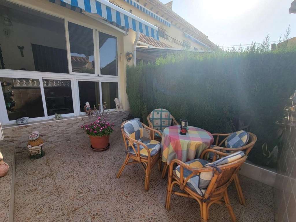 Precioso bungalow de planta baja, en muy buen estado, orientación Sur, con piscina comunitaria en Los Frutales. Dispone de una gran terraza delantera muy acogedora, un porche acristalado convertido en salón de Verano, un salón comedor, una cocina semi abierta totalmente equipada con acceso a un gran patio trasero, dos dormitorios dobles (dormitorio principal con cuarto de baño en-suite), dos cuartos de baño con duchas y dos trasteros. Amueblado. Aire acondicionado. Se puede aparcar el vehículo enfrente de la vivienda. Todo ello ubicado en un bonito Residencial cerrado con piscina y jardines a unos 20 minutos a pie de la Playa de Los Locos y del Parque de la Torre del Moro. Con todos los servicios, restaurantes, cafeterias, supermercados, paradas de autobús, etc..., a proximidad.