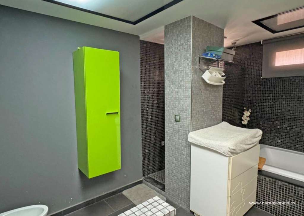 En la planta superior encontrarás la lujosa suite principal, con cama king-size, baño en suite con ducha y bañera, y un vestidor completo. Este santuario ofrece espacio y privacidad, creando un refugio sereno. También en esta planta hay dos dormitorios adicionales y un segundo baño equipado con ducha.