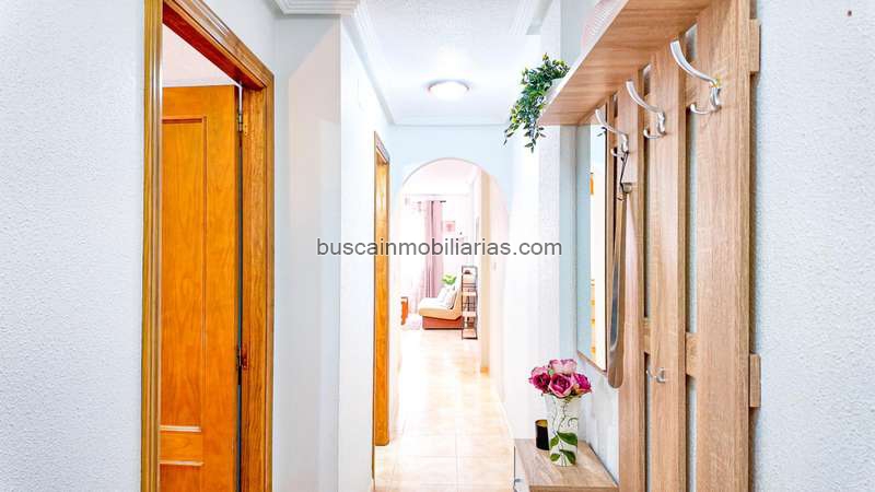 El hall de entrada es amplio y cuenta con espacio para abrigos y calzado. A la izquierda se encuentra el dormitorio principal, equipado con un gran armario empotrado.