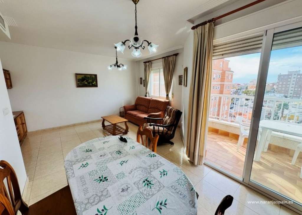 Es un apartamento situado en Nueva Torrevieja. Es un edificio construido en el año 99. La vivienda tiene unos 70 m2 construidos distribuidos en 2 dormitorios, amplio salón comedor, amplia cocina independiente, baño completo y terraza orientada al Sur.La vivienda es todo exterior ya que hace esquina.Aire acondicionado por conductos.La vivienda incluye una amplia plaza de garaje y un trastero.Piscina comunitaria.
