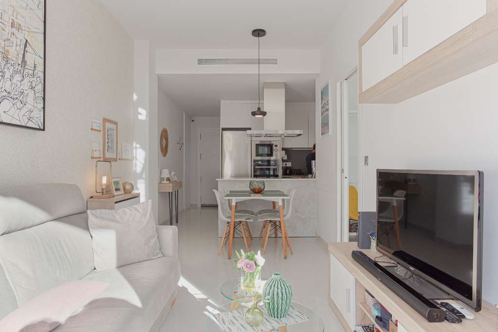 Este apartamento de 1 dormitorio y 1 baño está en excelente estado, en un edificio construido en 2021. Se vende totalmente amueblado, con muebles de alta calidad y listos para usar.El dormitorio dispone de un armario y una cama con arcón, que permite aprovechar el espacio de almacenamiento bajo el colchón. En el salón hay un sofá cama, ideal para invitados o para ampliar la capacidad de alojamiento.Junto a la cocina se encuentra un utility room, donde está instalado el calentador de agua y espacio adicional para almacenamiento.La cocina está totalmente equipada y abierta al salón, que disfruta de una excelente orientación sur, ofreciendo un ambiente luminoso y acogedor durante todo el día.La vivienda incluye plaza de garaje y el residencial dispone de piscina comunitaria.Un apartamento moderno, como nuevo, ideal para vivir todo el año o como inversión.
