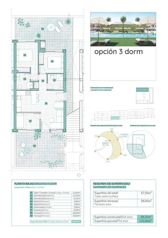 Las residencias constan de 2 dormitorios y 2 baños, con la opción de un tercer dormitorio para adaptarse a sus necesidades. Cada apartamento ofrece espectaculares vistas de la laguna rosa de Torrevieja, creando una experiencia única donde la naturaleza se convierte en una parte integral de su vida diaria.