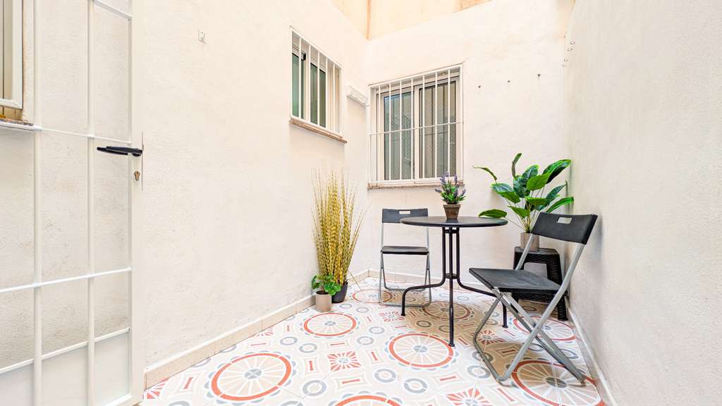La cocina dispone de buen espacio de almacenamiento y acceso directo al lavadero y al patio privado. Una barra americana conecta la cocina con el salón, creando un ambiente social. Desde el salón se accede al segundo dormitorio y al balcón.