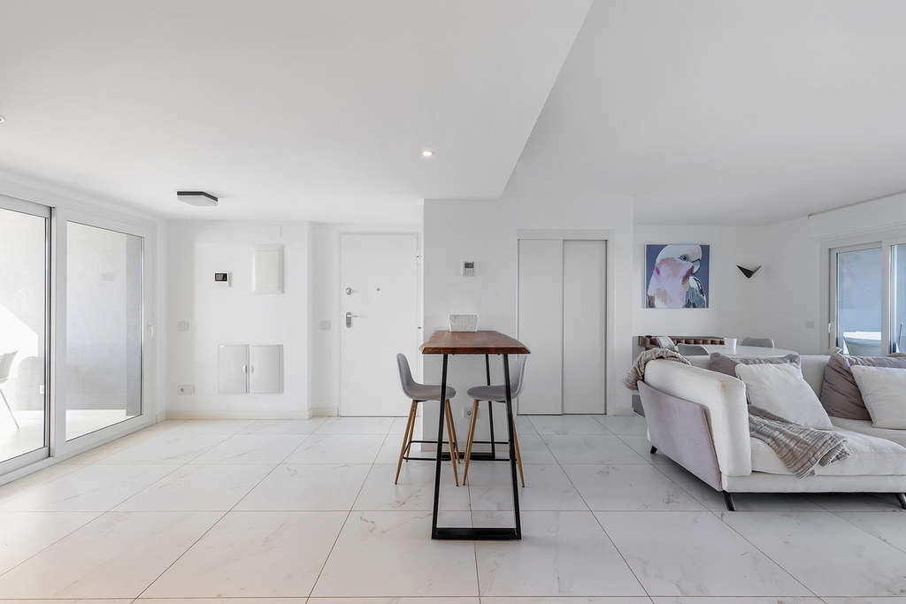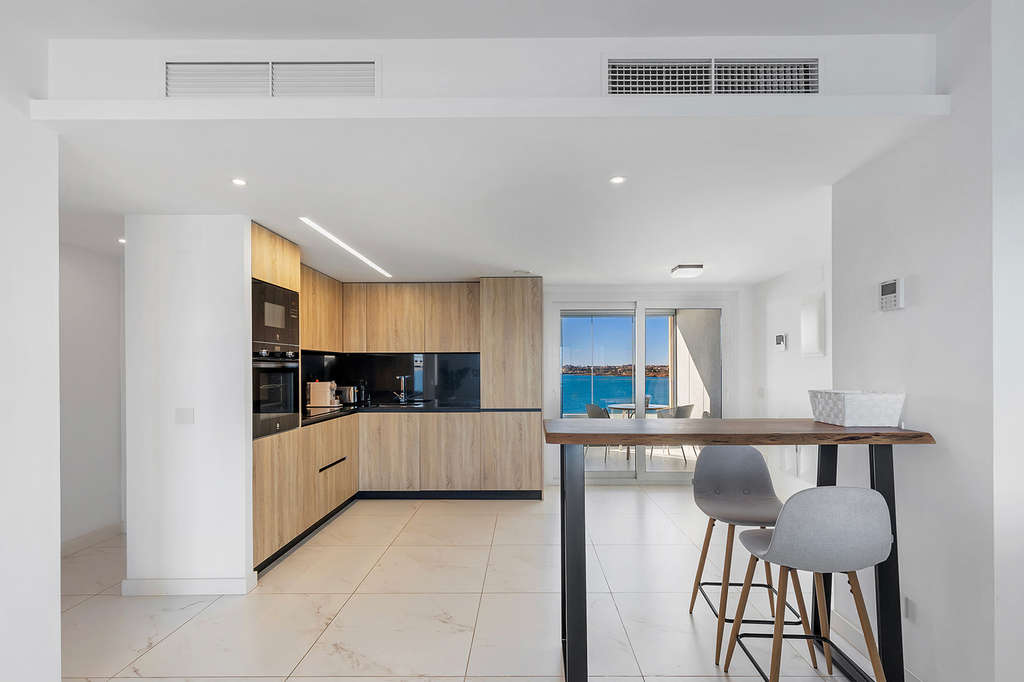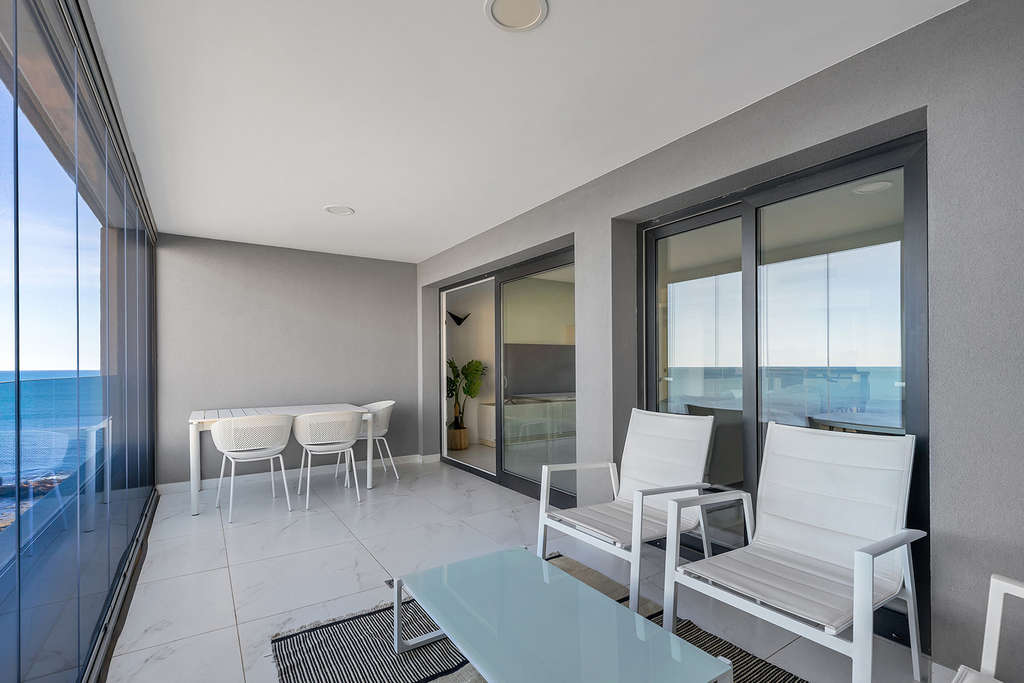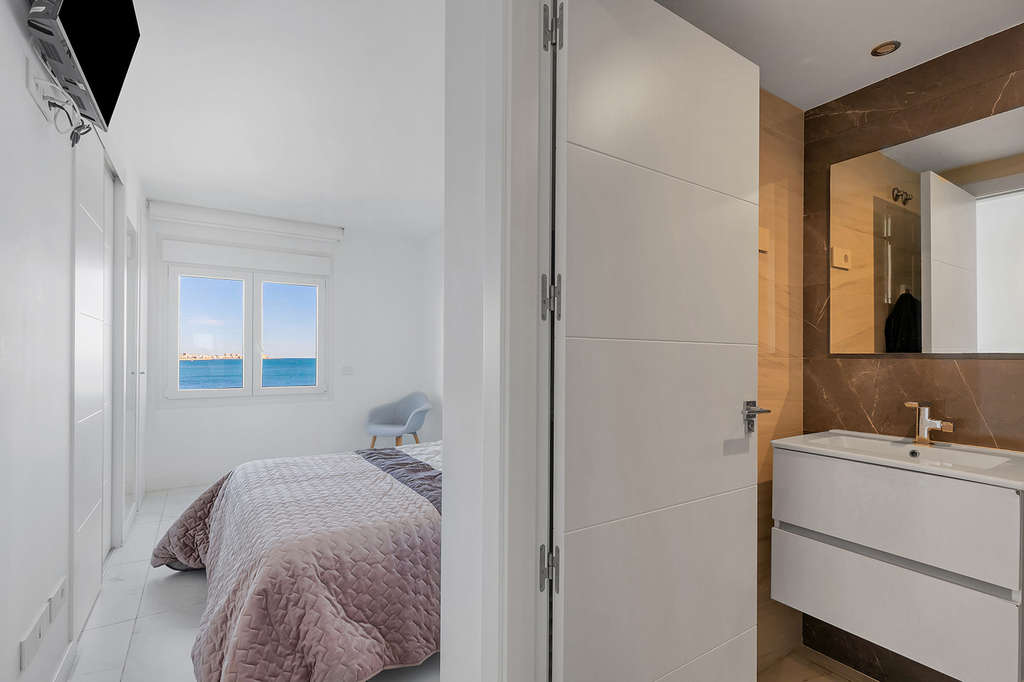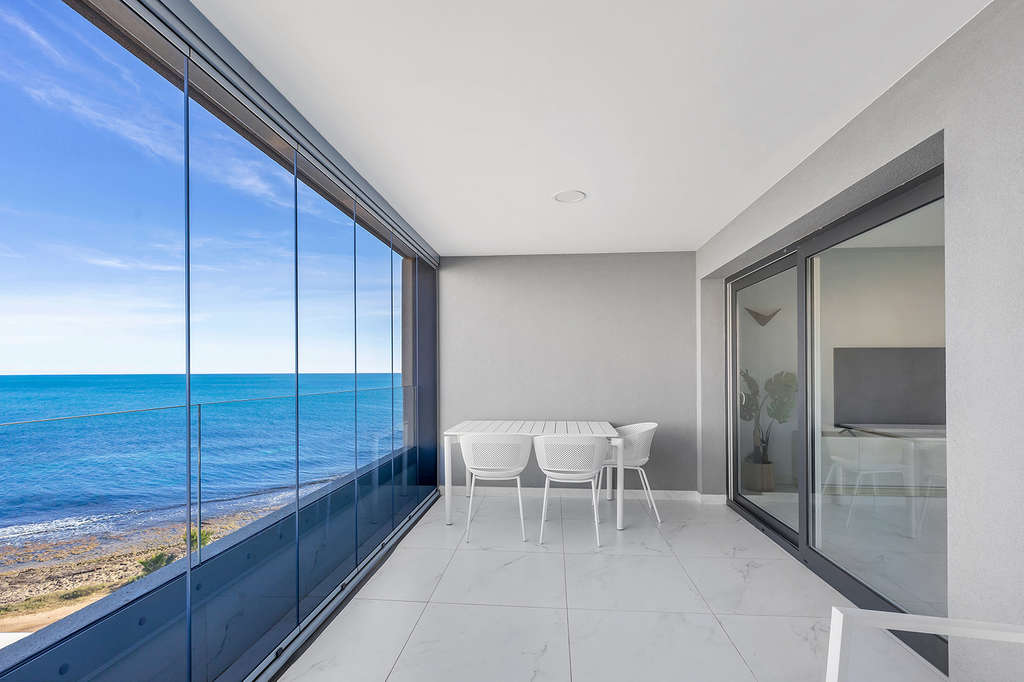 Este exclusivo apartamento en quinta planta se ubica en el prestigioso residencial Posidonia, en primera línea de mar en Punta Prima. Originalmente proyectado con tres dormitorios, la vivienda fue modificada sobre plano para ofrecer 94 m² de puro confort, distribuidos ahora en dos amplios dormitorios y dos baños, ganando así una amplitud excepcional en las zonas de día.Su punto fuerte es la doble orientación y sus espacios exteriores: una terraza de 16m² con vistas despejadas al mar y la bahía de Torrevieja, y una segunda terraza trasera de 12m2 con orientación sur y vistas hacia La Manga, garantizando sol, luz natural y ventilación cruzada durante todo el día.La propiedad se entrega totalmente amueblada, con plaza de garaje subterránea y trastero incluidos. El complejo cuenta con zonas comunes de alto standing y seguridad. Ubicado a pie de servicios, supermercados y calas, se encuentra a aproximadamente 45 minutos del Aeropuerto de Alicante, conectando lujo y comodidad en una de las zonas más demandadas de la Costa Blanca.