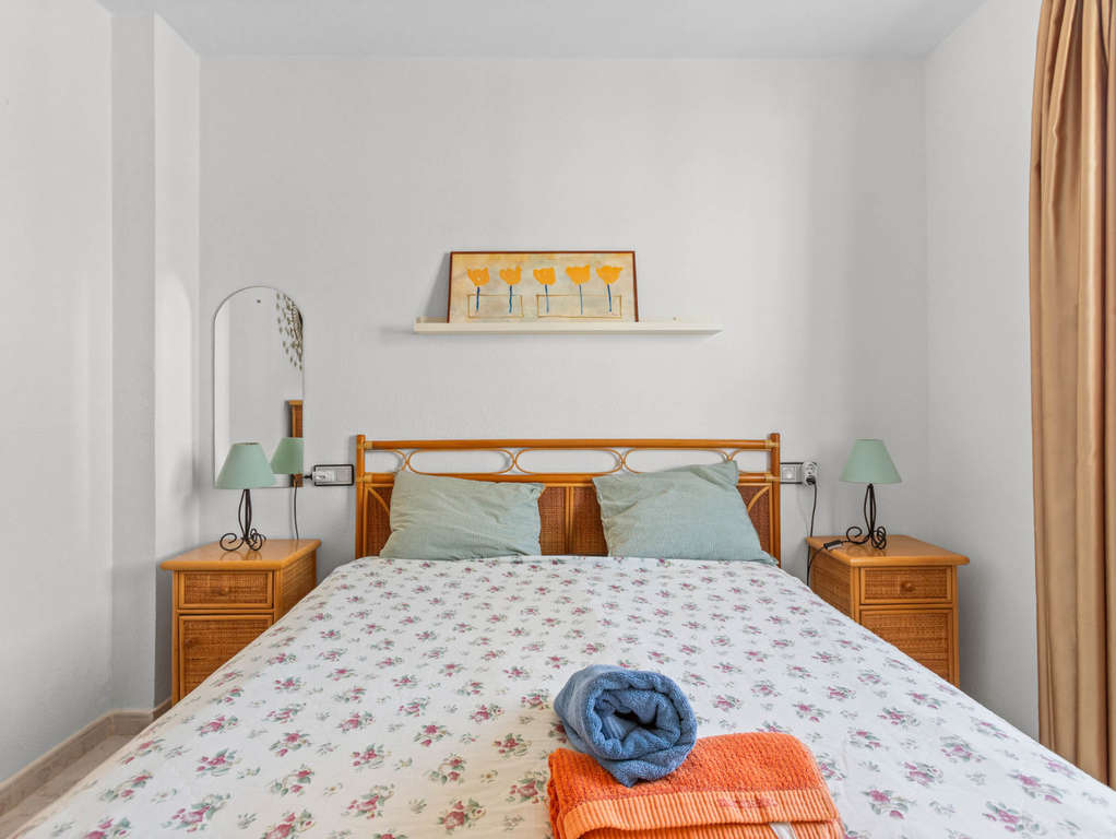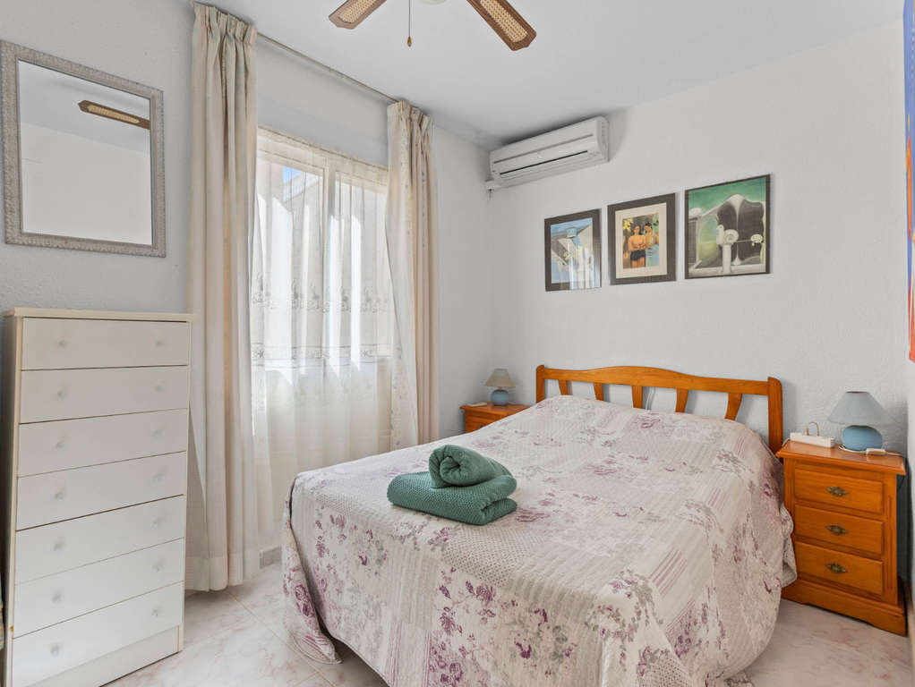 La vivienda dispone de dos dormitorios, un baño, cocina y un salón que da acceso a un balcón cubierto. Cuenta con tres bombas de calor (aire acondicionado inverter), una en cada estancia principal, lo que garantiza un ambiente confortable durante todo el año.