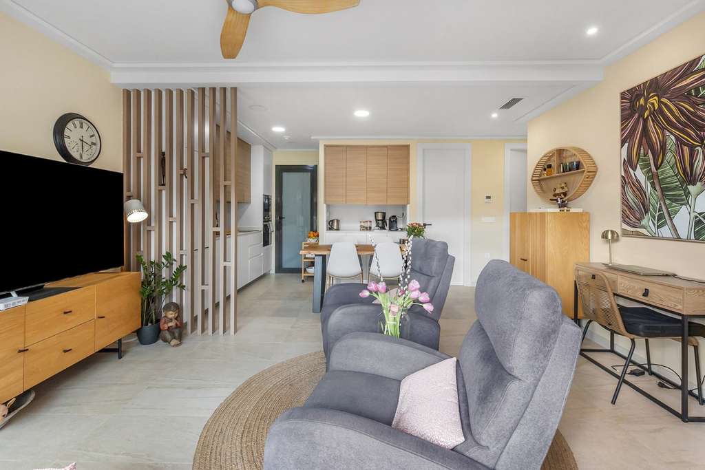La elegante sala de estar con cocina abierta y totalmente equipada se integra a