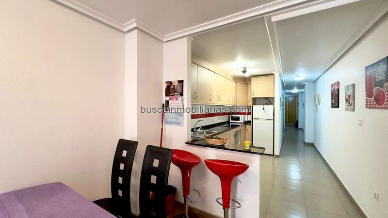 Apartamento acogedor y funcional de 2 dormitorios y 1 baño en una de las calles más céntricas y demandadas de Torrevieja, la conocida calle Apolo, a un agradable paseo de la playa y rodeado de todos los servicios durante todo el año. Entorno y ubicación Vivir en calle Apolo significa disfrutar del auténtico centro de Torrevieja, en una zona urbana consolidada, bien comunicada y con una amplia oferta de comercios, supermercados, bancos, cafeterías y restaurantes a escasos metros de casa. Las principales arterias comerciales, como las calles cercanas al paseo marítimo y la Plaza de la Constitución, se encuentran a pocos minutos caminando, lo que permite realizar las gestiones del día a día sin necesidad de utilizar el coche. La playa del Cura y el puerto deportivo están también a un corto paseo, convirtiendo este apartamento en una opción ideal para quienes desean combinar vida urbana y cercanía al mar en la Costa Blanca. Edificio y ambiente residencial El apartamento se integra en un edificio de estilo contemporáneo típico del centro de Torrevieja, con portal cuidado y ambiente principalmente residencial, donde conviven familias, parejas jóvenes y residentes extranjeros que han elegido la ciudad por su clima y calidad de vida. La calle Apolo está formada por bloques de viviendas de varias plantas, con locales en planta baja y viviendas en altura, lo que genera un entorno vivo durante el día pero tranquilo por las noches, perfecto para uso habitual o como segunda residencia. Se trata de una zona llana y caminable, con calles asfaltadas y trazado urbano ordenado, que facilita el acceso a personas de todas las edades y convierte los desplazamientos diarios en paseos cómodos y agradables. Distribución interior Al entrar a la vivienda, un recibidor da paso a la zona de día, donde se articula el salón–comedor en torno a la cocina americana, creando un único espacio amplio y práctico que aprovecha al máximo los metros disponibles. La distribución separa de forma natural la parte social de la vivienda de la zona de descanso, donde se encuentran los dos dormitorios y el baño, lo que aporta privacidad tanto para una familia como para quienes quieran combinar estancia y teletrabajo. El diseño interior responde al concepto de apartamento urbano funcional, con pasillos reducidos y estancias bien proporcionadas, pensado para ofrecer comodidad en el uso diario sin renunciar a zonas diferenciadas para descansar y recibir visitas. Salón comedor El salón comedor es el corazón de la vivienda, un espacio luminoso que recibe la luz natural procedente del balcón y que se presta tanto a momentos de relax como a reuniones con amigos y familiares. Su planta rectangular facilita la colocación de un cómodo sofá frente a la zona de televisión, así como una mesa de comedor para varios comensales, creando un ambiente versátil que se adapta a diferentes estilos de decoración, desde los más modernos a los más mediterráneos. La conexión visual directa con la cocina americana y el acceso al balcón refuerzan la sensación de amplitud, convirtiendo este ambiente en un espacio fluido donde la vida diaria transcurre con naturalidad, desde desayunos tranquilos hasta veladas más sociales. Cocina americana equipada La vivienda dispone de una cocina americana equipada que se integra en la zona de día, ofreciendo una solución cómoda y moderna para quienes valoran la practicidad y el contacto directo con el resto de la casa mientras cocinan. Este tipo de cocina facilita la comunicación con el salón, permite atender a invitados o familiares mientras se preparan las comidas y contribuye a que la luz natural procedente del balcón llegue también hasta la zona de trabajo. La disposición del mobiliario y la encimera está pensada para aprovechar el espacio, con zona de cocción, preparación y almacenaje organizada, ideal tanto para un uso vacacional como para quienes piensan residir todo el año en el apartamento.