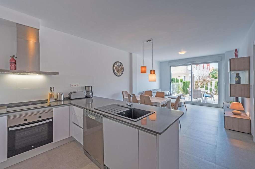 Bonito piso en planta baja en La Isla Tenemos el placer de presentar este bonito y casi nuevo apartamento en el popular complejo La Isla en Torrevieja. El apartamento consta de un pequeño recibidor, 3 bonitas habitaciones, 2 baños, uno en suite. Un amplio y bonito salón con cocina americana, pero todos los electrodomésticos, y un pequeño cuarto trasero, con lavadora con secadora integrada. El apartamento está equipado con aire acondicionado por conductos, que puede proporcionar aire frío y caliente. Hay una gran zona de ventanales, con acceso a una bonita terraza/jardín, desde la que también hay acceso directo a las zonas comunes y a una gran zona de piscina cubierta. También hay una plaza de aparcamiento privada en el sótano incluida en el precio. El apartamento está muy bien amueblado. Una oferta realmente buena que hay que ver.