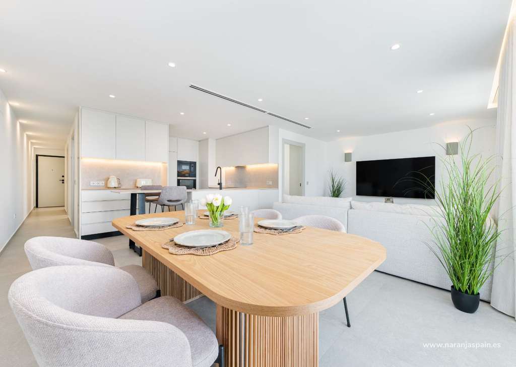 El luminoso salón se integra con una cocina totalmente equipada, creando un ambiente sofisticado y acogedor.