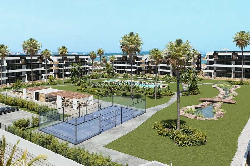 El residencial ofrece zonas comunes exclusivas que incluyen piscina comunitaria para adultos y niños, amplias áreas ajardinadas con palmeras de hasta 6 metros, zona de barbacoa, parque infantil, pista de pádel, campo de petanca, estanque al aire libre y un área de fitness exterior, diseñados para aportar bienestar y un estilo de vida moderno en un entorno mediterráneo.