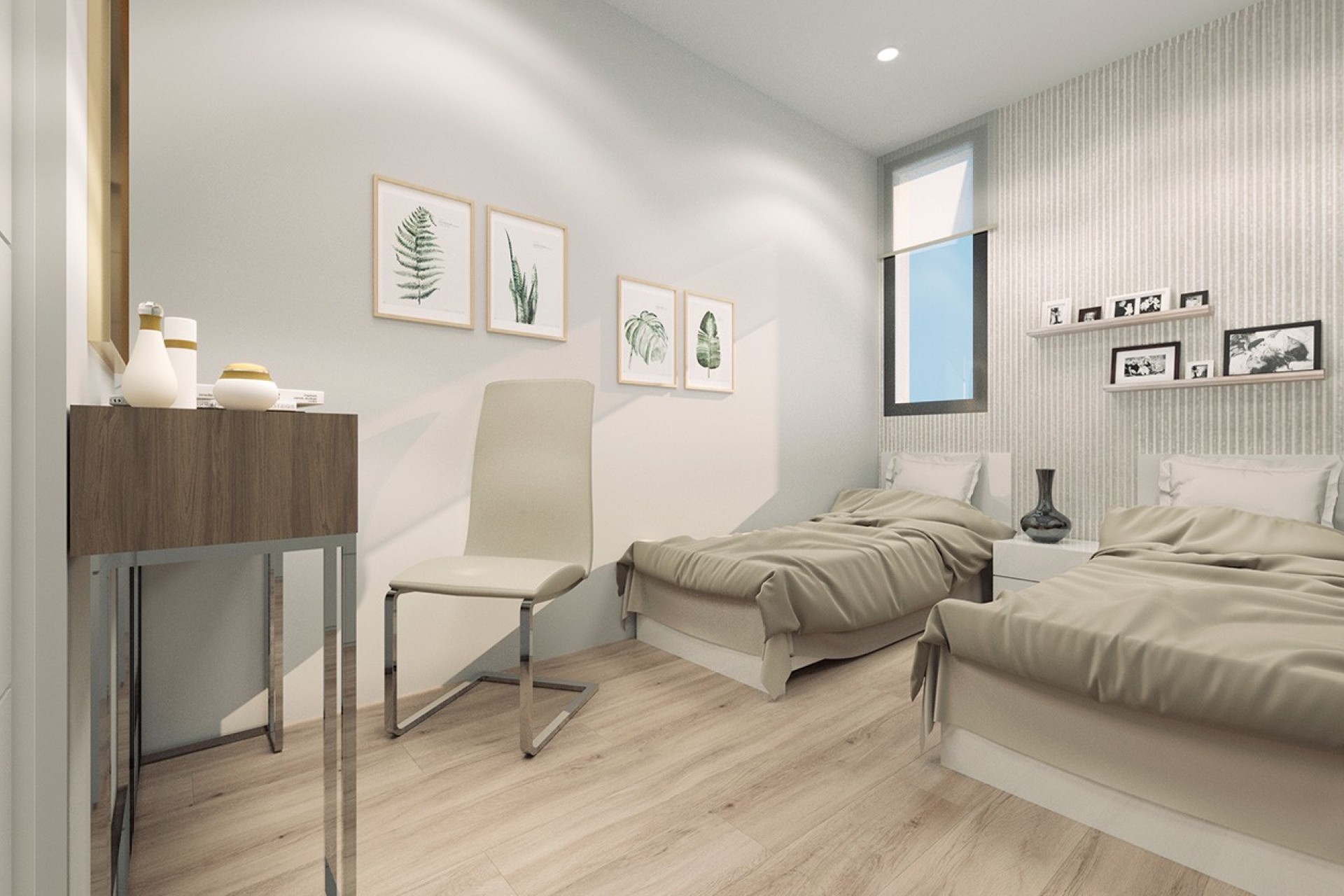 Las viviendas incorporan prestaciones de alto nivel, como baños completamente equipados con suelo radiante, cocinas modernas con electrodomésticos de alta gama, armarios empotrados revestidos en madera con cajoneras, iluminación incluida en toda la vivienda, persianas eléctricas y preinstalación de aire acondicionado por conductos. Además, el sistema de agua caliente sanitaria funciona mediante aerotermia, una solución eficiente y sostenible que reduce el consumo energético.