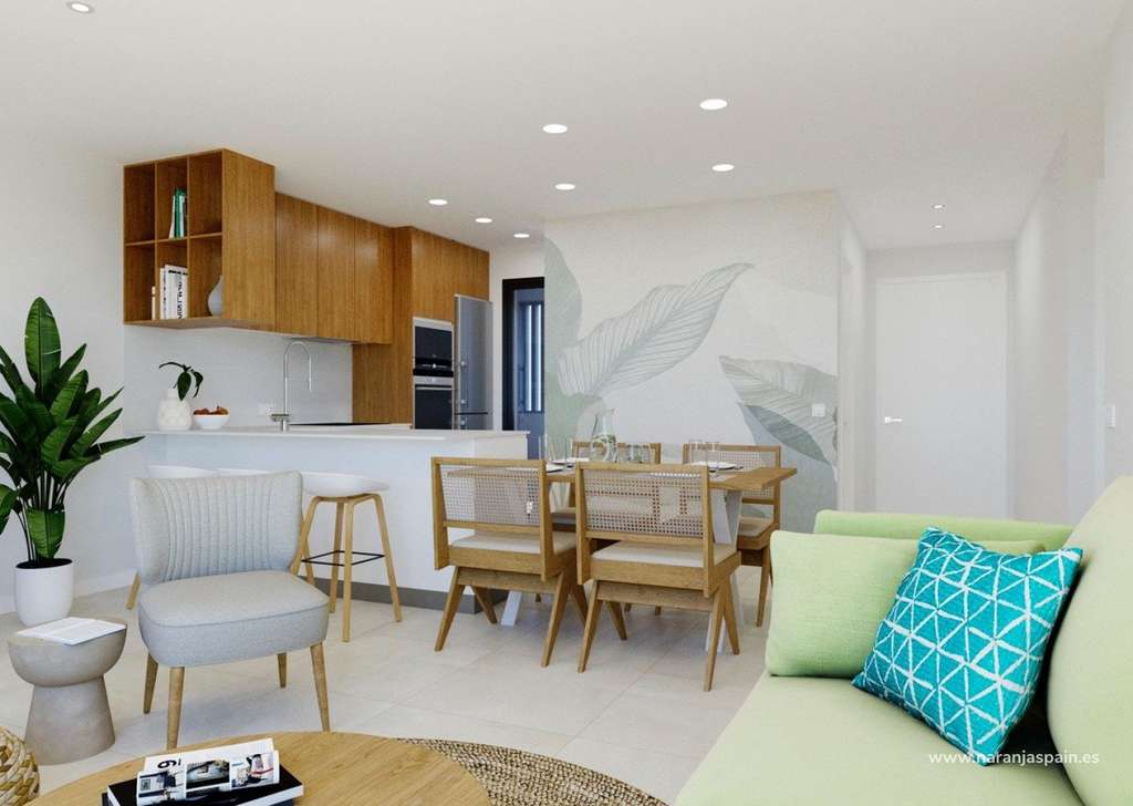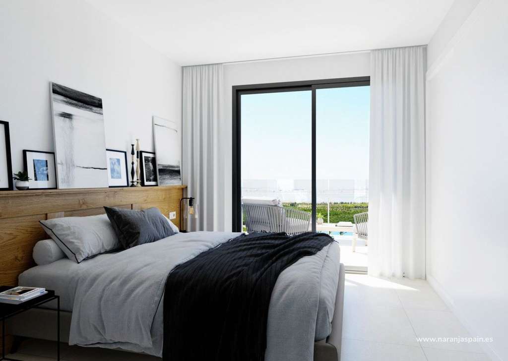 Los bungalows de planta alta disponen de 2 dormitorios, 2 baños, cocina americana con amplio salón, armarios empotrados, terraza, solarium privado y plaza de aparcamiento subterráneo.