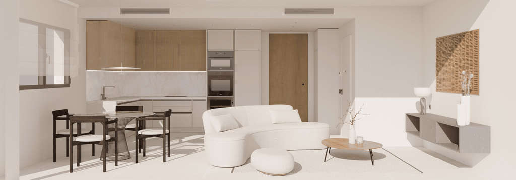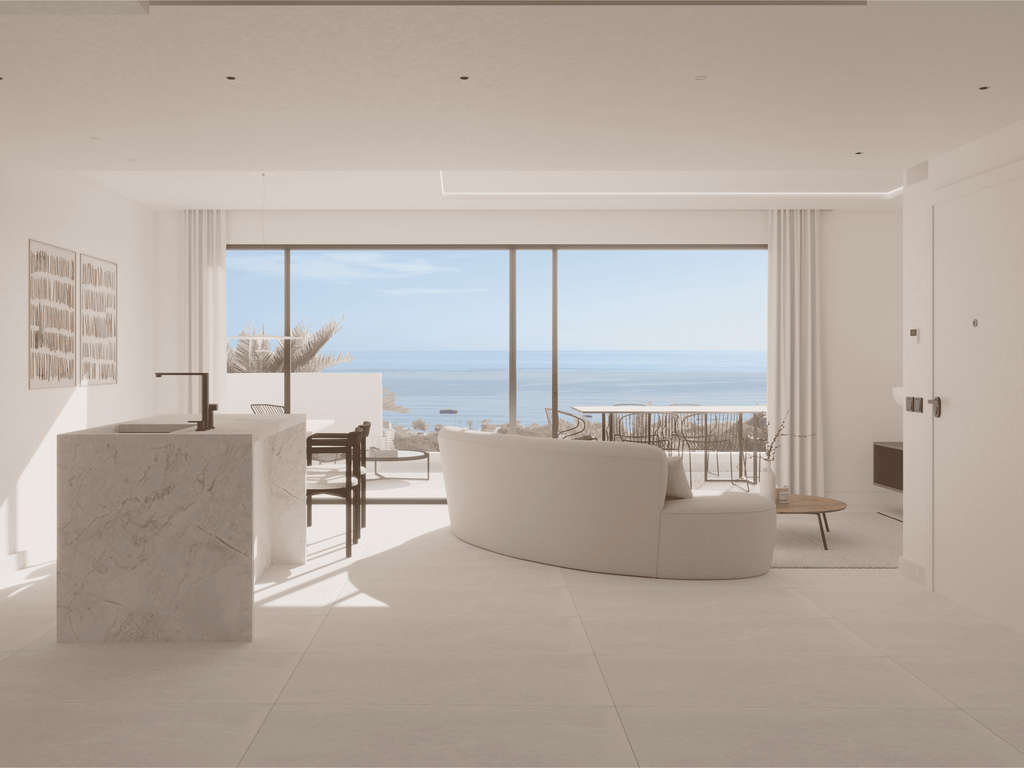 Las viviendas destacan por su distribución versátil y adaptable a diferentes estilos de vida. Los espacios son amplios y luminosos, con grandes ventanales que permiten disfrutar de vistas al mar desde cualquier estancia. Los apartamentos en planta baja incluyen un semisótano con opción de añadir dormitorios adicionales, mientras que los de planta alta ofrecen estancias diáfanas y acabados de primera calidad. La cocina de concepto abierto está equipada con electrodomésticos modernos, y los dormitorios cuentan con armarios empotrados y una distribución eficiente.