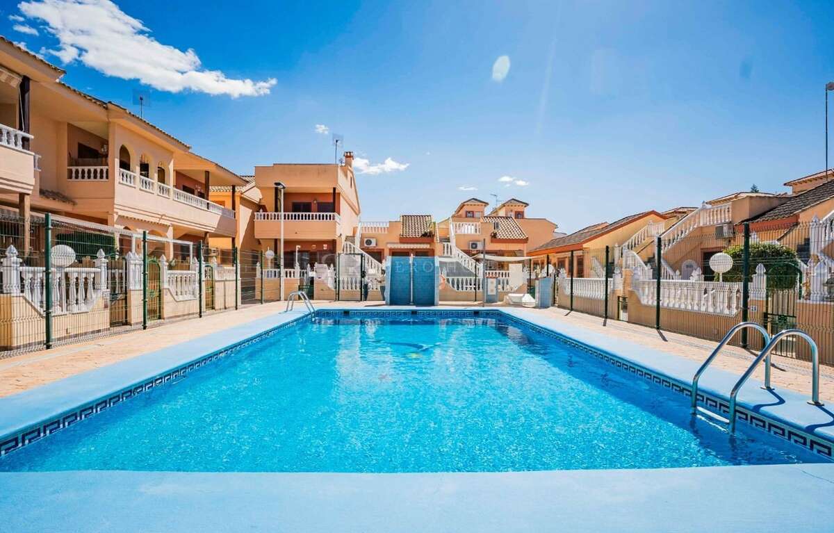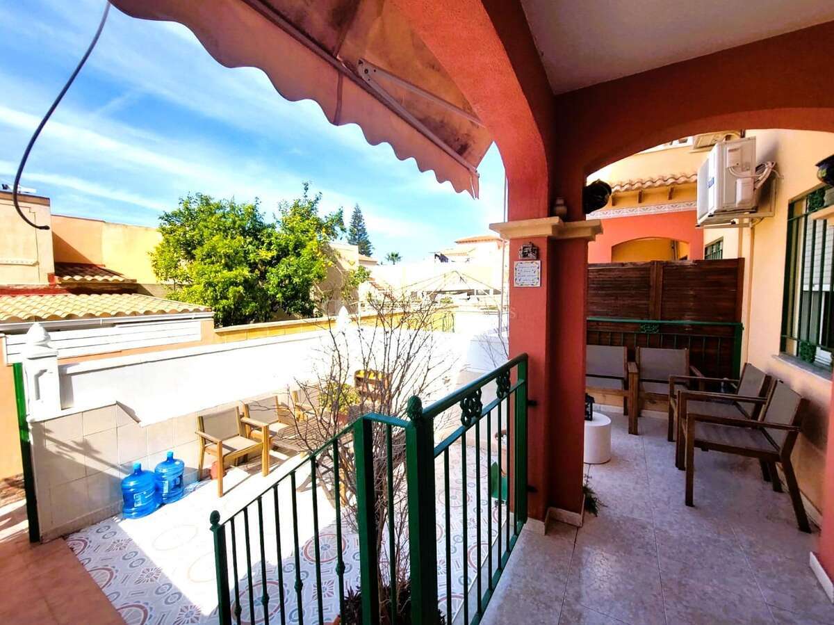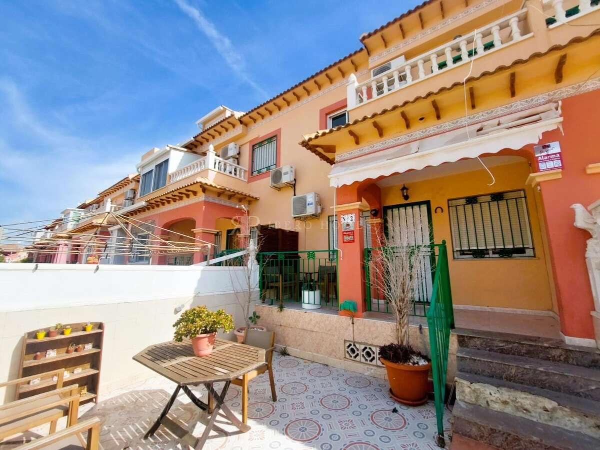 Adosado de 2 dormitorios con jardín soleado y porche cubierto de 20m aproximadamente. ~~En planta baja encontramos el salón-comedor, aseo, cocina abierta y zona de galería cubierta. En la primera planta hay 2 dormitorios y 1 baño y acceso a la segunda planta, donde llegamos a un amplio solarium, con vistas despejadas a la laguna rosa.~~Incluye plaza de parking dentro de la urbanización.~~Se encuentra ubicado en la urbanización Salado II, con piscina comunitaria, en una zona muy tranquila y con acceso a zonas verdes y a la laguna rosa y cerca de paradas de autobús, supermercados, restaurantes, tiendas y a tan solo unos minutos del Centro Comercial Habaneras y del centro de Torrevieja.~