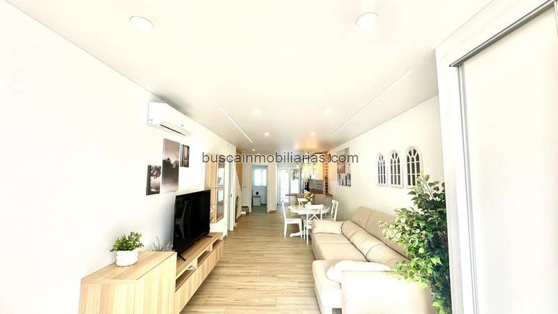 Ubicada en la Avenida París, en una zona residencial tranquila y bien comunicada, esta acogedora casa adosada se encuentra a tan solo un kilómetro y medio de la playa, combinando la cercanía al mar con la comodidad de vivir en un entorno más residencial. Es una opción ideal tanto para quienes buscan una vivienda habitual como para quienes desean una segunda residencia cerca de la costa. En la planta baja, la vivienda cuenta con un amplio y luminoso salón comedor, diseñado para ofrecer un espacio cómodo y funcional destinado al descanso y a la vida en familia. La cocina de estilo francés-americano, abierta y moderna, se integra perfectamente con la zona de día, creando una sensación de amplitud y favoreciendo la convivencia. Desde esta planta se accede a un patio trasero, un espacio exterior muy práctico para zona de lavandería, almacenamiento o para disfrutar de comidas al aire libre. Además, dispone de un dormitorio en la planta inferior y un aseo, lo que aporta comodidad adicional y resulta especialmente útil para invitados o personas con movilidad reducida. La vivienda también cuenta con un patio delantero, ideal como terraza privada, zona de descanso o pequeño jardín de bienvenida, aportando un valor añadido al espacio exterior de la propiedad. En la segunda planta se encuentran dos dormitorios dobles, amplios, luminosos y confortables, ambos con acceso directo a sus propias terrazas privadas, perfectas para disfrutar del sol, la ventilación natural y momentos de tranquilidad en el exterior. En esta misma planta se sitúa un cuarto de baño completo con plato de ducha, moderno y funcional, que da servicio a ambos dormitorios. La propiedad cuenta con una excelente orientación sur y norte, lo que garantiza luz natural a lo largo de todo el día y permite una ventilación cruzada que contribuye a mantener un ambiente fresco y agradable durante todo el año. Además, la vivienda forma parte de una urbanización con piscina comunitaria, perfecta para relajarse y disfrutar del buen clima mediterráneo sin necesidad de desplazarse. En conjunto, esta casa adosada en Avenida París ofrece una combinación ideal de espacio, comodidad, funcionalidad y zonas exteriores, en un entorno tranquilo y bien ubicado, convirtiéndose en una excelente opción para disfrutar de la vida mediterránea con todas las comodidades.