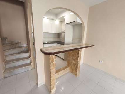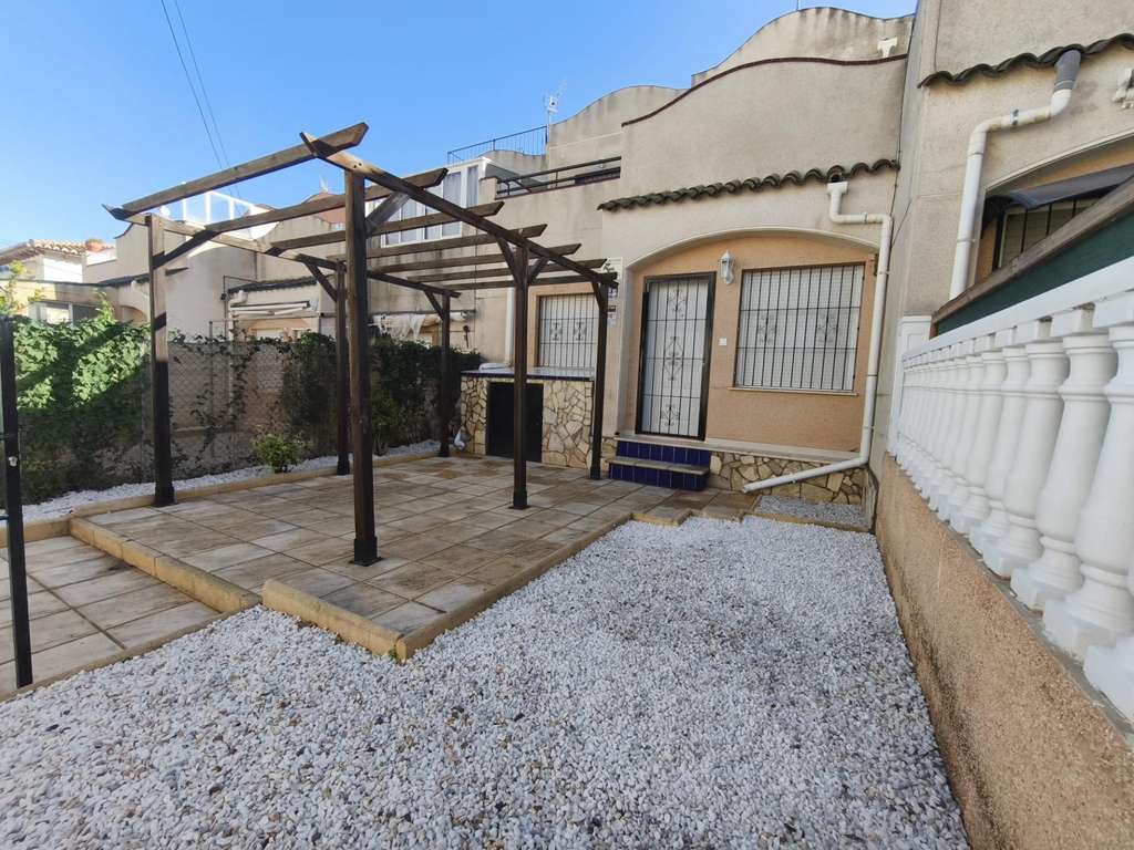 Bungalow-dúplex adosado de planta baja y alta y jardín delantero con urbanización con piscina. Reformado, para entrar a vivir. La planta baja cuenta con salón-comedor, cocina con barra americana con mobiliario nuevo a estrenar (muebles altos y bajos, encimera de mármol negro, campana extractora de acero inoxidable y termo eléctrico), un dormitorio y un baño completo. En la planta alta, a la que se accede por escalera interior, cuenta con dos dormitorios comunicados entre sí, desde los que se accede a un amplio balcón- terraza con estupendas vistas. Se accede al bungalow mediante una calle peatonal y por medio de su parcela de 30 m2 dedicada a jardín en la que actualmente existe un cenador de madera, encontrándose solada una parte y el resto con grava blanca. Urbanización con piscina comunitaria y zonas verdes de esparcimiento colectivo.