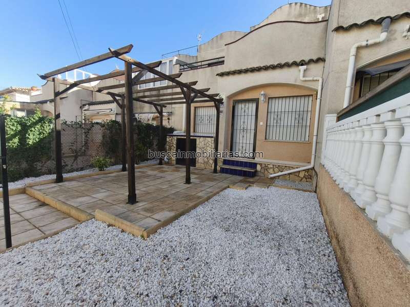Bungalow-dúplex adosado de planta baja y alta y jardín delantero con urbanización con piscina. 55 m2 construidos más 30 m2 de parcela ajardinada en su frente. Reformado, para entrar a vivir. La planta baja cuenta con salón-comedor, cocina con barra americana con mobiliario nuevo a estrenar (muebles altos y bajos, encimera de mármol negro, campana extractora de acero inoxidable y termo eléctrico), un dormitorio y un baño completo. En la planta alta, a la que se accede por escalera interior, cuenta con dos dormitorios comunicados entre sí, desde los que se accede a un amplio balcón- terraza con estupendas vistas. Se accede al bungalow mediante una calle peatonal y por medio de su parcela de 30 m2 dedicada a jardín en la que actualmente existe un cenador de madera, encontrándose solada una parte y el resto con grava blanca. Urbanización con piscina comunitaria y zonas verdes de esparcimiento colectivo.