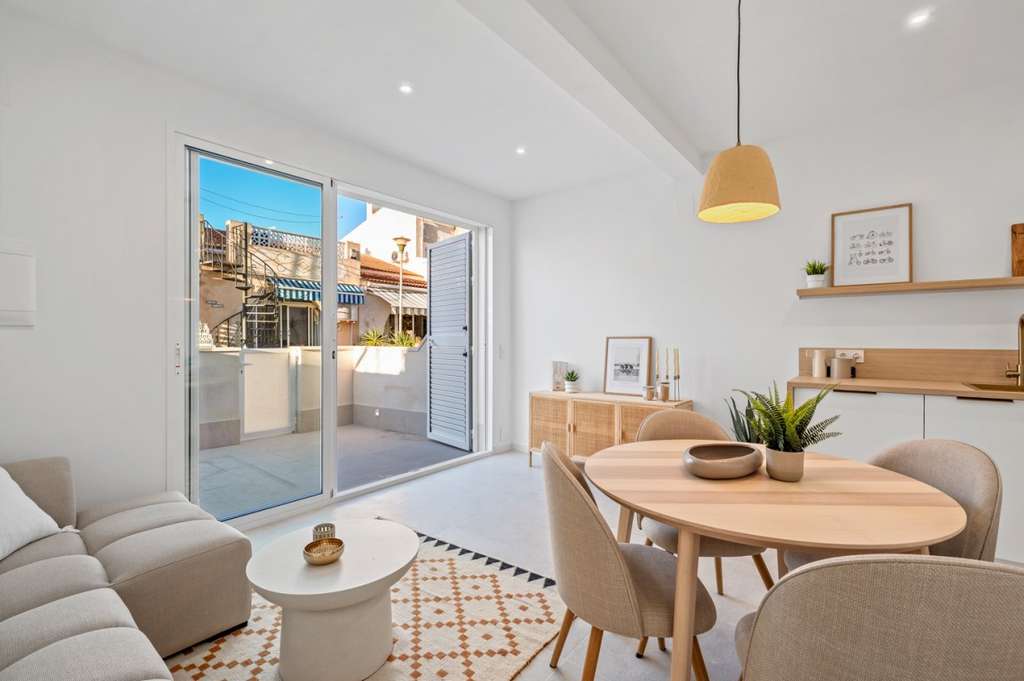 Al entrar en la casa, se accede a un espacio abierto y luminoso con una cocina totalmente equipada, perfectamente integrada en el salón. Los acabados modernos y los materiales neutros crean un ambiente agradable y atemporal.