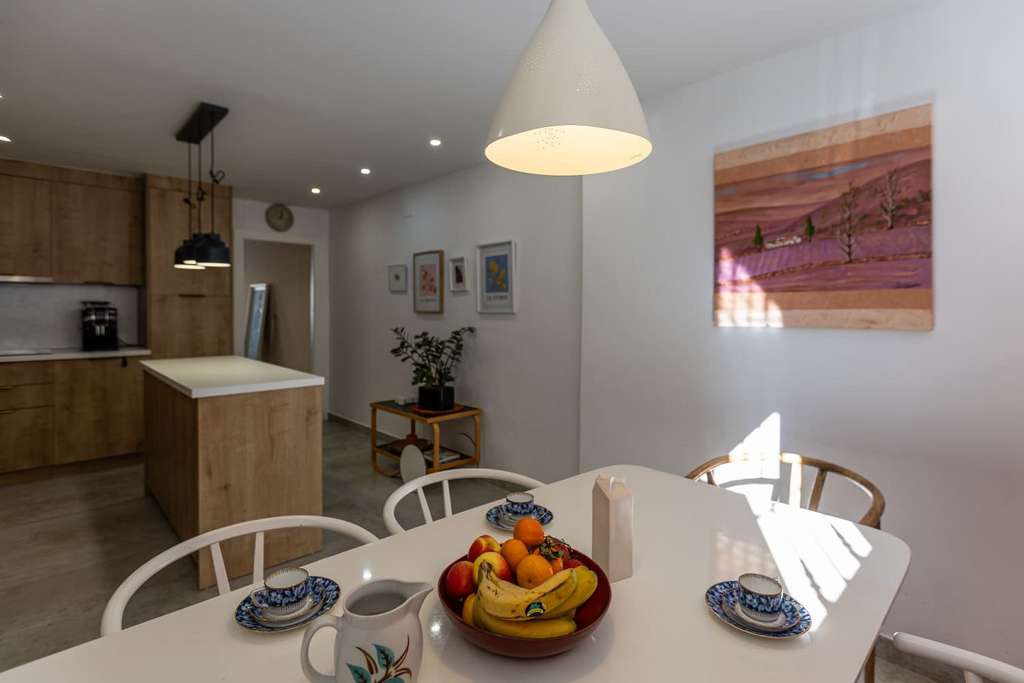 Amplio comedor con una moderna cocina totalmente equipada con isla.