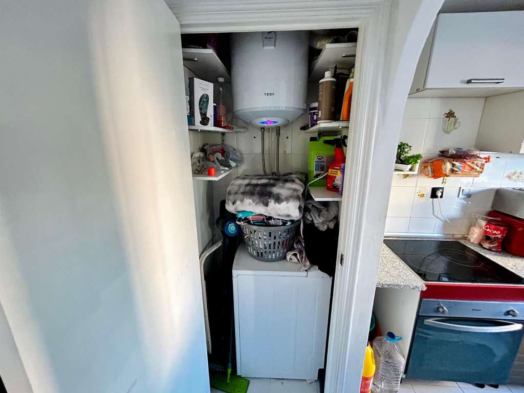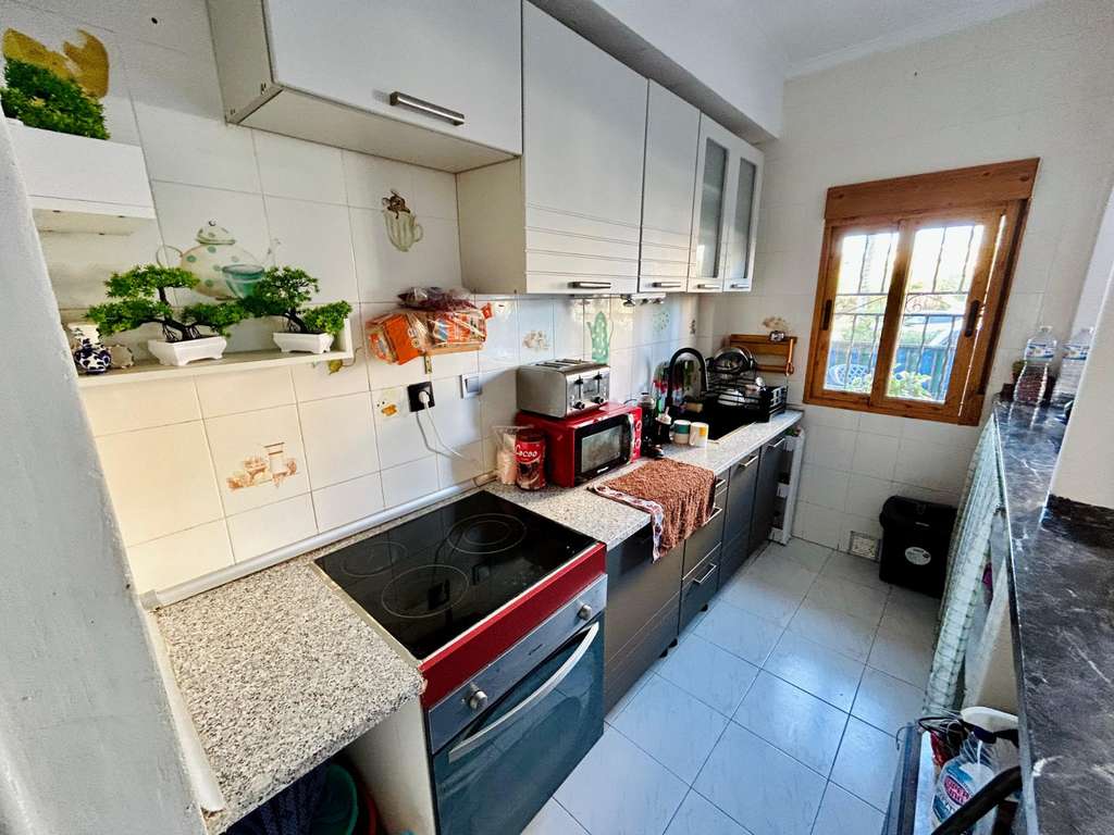 La vivienda está situada en la planta baja, donde se encuentra una acogedora terraza al norte con buen espacio para, por ejemplo, un conjunto de muebles.Una vez dentro, lo recibe un espacio abierto entre una sala de estar con espacio para una mesa de comedor y una cocina totalmente equipada con mucho almacenamiento. En esta planta también se accede a un trastero donde se han colocado una lavadora y el calentador. También hay un baño completo con ducha.Una planta más arriba se encuentran los dos amplios dormitorios de la vivienda, uno de ellos con armario empotrado y un baño completo con bañera.Desde ambos dormitorios se accede a un acogedor balcón con vista a la calle.Perteneciente a la zona residencial, se encuentra una agradable y apreciada zona de piscina comunitaria.