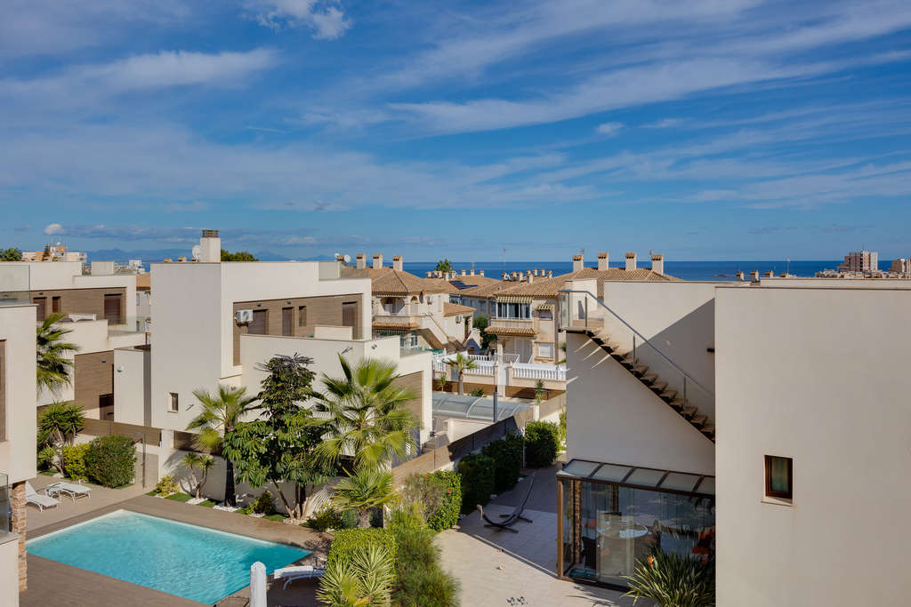 EXTERIORES El diseño exterior de estas villas refleja la esencia del estilo mediterráneo, con líneas limpias y modernas que se integran armoniosamente con el entorno natural de Torrevieja. Cada villa dispone de un espacioso jardín privado que incluye una piscina, perfecta para disfrutar de los soleados días de la Costa Blanca. La parcela de 420 m² proporciona suficiente espacio para la relajación al aire libre, con áreas ajardinadas cuidadosamente diseñadas que aportan un toque de verdor y frescura. Además, la plaza de aparcamiento fuera de la carretera asegura comodidad y seguridad para los residentes. El solárium privado es un lugar destacado, ofreciendo vistas panorámicas de la zona y un espacio adicional para tomar el sol o disfrutar de reuniones al aire libre. La fachada de las villas está diseñada con materiales de alta calidad que no solo garantizan durabilidad, sino que también añaden un atractivo visual sofisticado y contemporáneo.