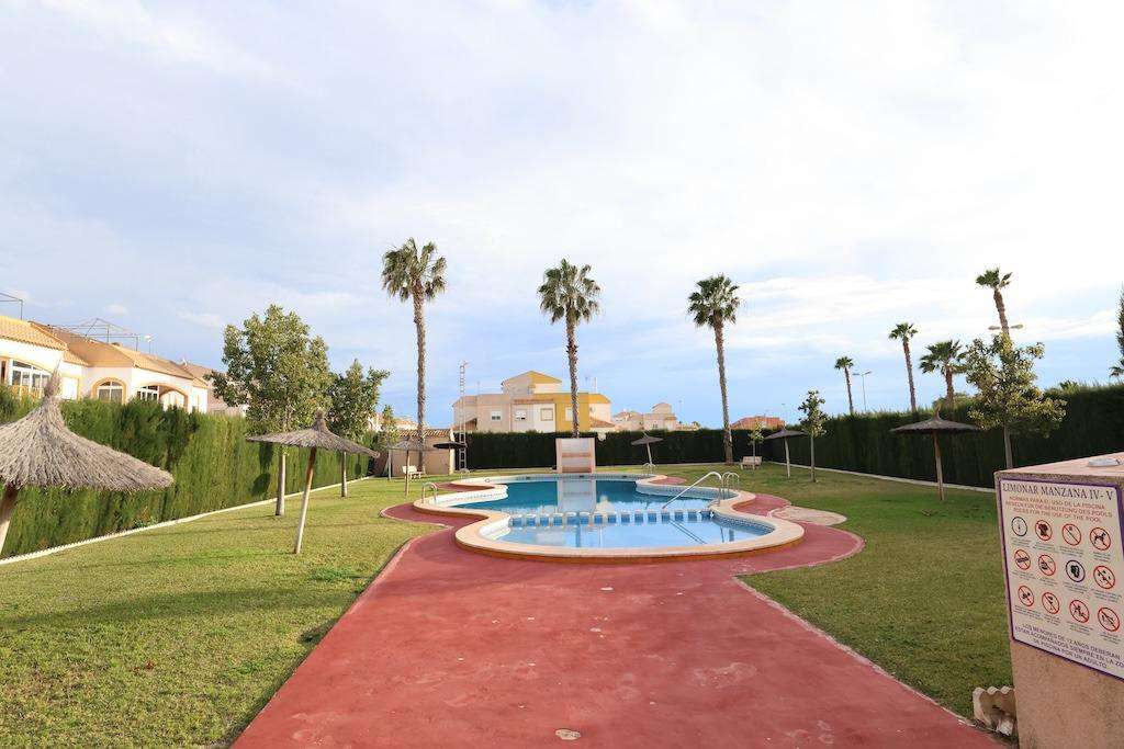 Altos del Limonar Adosado en esquina orientación Sur, con entrada para varios coches, la vivienda dispone de 90 m2 en dos plantas mas solarium de 26 m2, cuenta con 3 dormitorios (todos en la planta de arriba), 2 baños, cocina independiente y un amplio salñon comedor, desde el solarium se ve la piscina comunitaria y las zonas verdes, la vivienda se vende amueblada y con aire acondicionado.