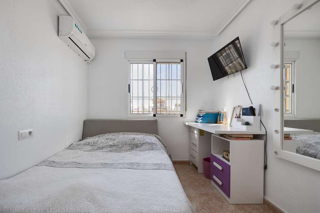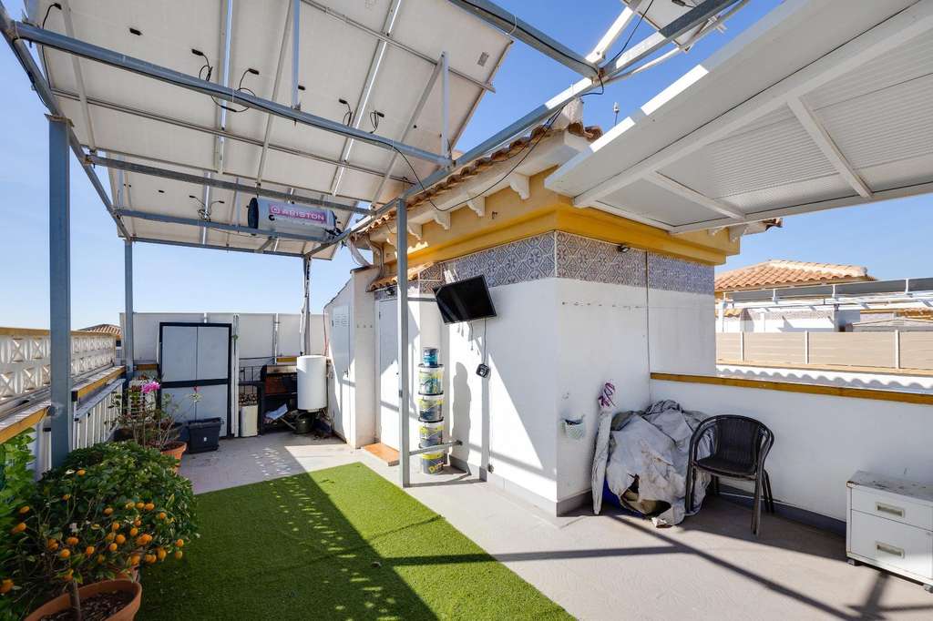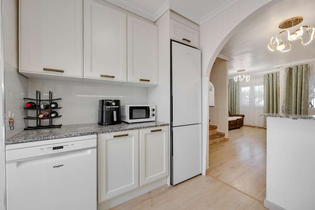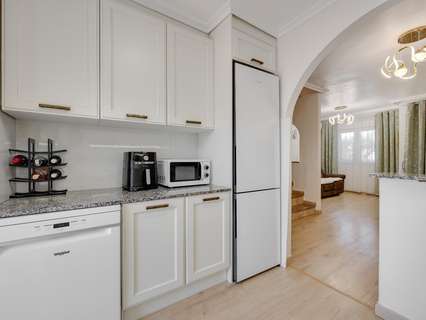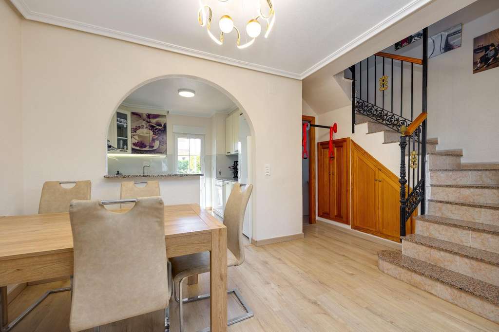 Adosado reformado de 3 dormitorios con solarium, piscina y parking en Aguas Nuevas Este fantástico adosado totalmente reformado es ideal tanto para vivir todo el año como para disfrutar de unas vacaciones con todas las comodidades. La vivienda cuenta con 91 m² construidos, perfectamente distribuidos en tres amplios dormitorios y dos baños completos, ofreciendo un espacio funcional y confortable para toda la familia. En el exterior, dispone de dos acogedores patios de 12 m² y 24 m², perfectos para crear diferentes ambientes como zona de relax, comedor al aire libre o incluso un espacio de juegos. Además, el solárium privado se convierte en el lugar ideal para disfrutar del sol durante todo el año con total privacidad. Ubicado en una urbanización con piscina comunitaria, parking y parque infantil, este adosado ofrece un entorno seguro y agradable, especialmente pensado para el bienestar familiar. Su excelente localización, cerca de todos los servicios necesarios como comercios, supermercados, restauración y transporte, garantiza una vida cómoda y práctica sin necesidad de largos desplazamientos. UBICACIÓN: Torrevieja se encuentra en la provincia de Alicante (Costa Blanca). Es famosa por su clima mediterráneo y su costa. No podemos olvidar sus paseos marítimos donde podemos encontrar algunos restaurantes a lo largo de las playas de arena fina. Además, cuenta con excelentes playas como la Playa de los Náufragos, la Playa de los Locos y la Playa de la Mata. Por lo tanto, se considera una localidad turística destacable donde el medio ambiente ocupa un lugar importante como reclamo turístico. Además, podemos encontrar numerosos centros comerciales (Habaneras, La Zenia Boulevard), campos de golf, centros deportivos, hospitales (como el Hospital Universitario de Torrevieja) y aeropuertos como el Aeropuerto de Alicante (a 35 km) y el Aeropuerto Internacional de la Región de Murcia (a 43 km). DISTANCIA AL MAR: 1300m COMUNIDAD: 400 € IBI: 250 € Si tiene alguna pregunta, no dude en ponerse en contacto con nosotros!