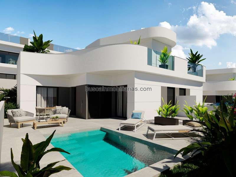 villa pareada de obra nueva con 3 dormitorios, 2 baños, cocina americana con amplio salón, armarios empotrados, jardín privado con piscina y plaza de aparcamiento exterior, solarium privado.