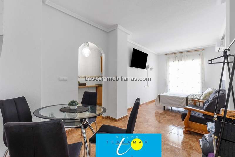 Se vende estudio en buen estado, ubicado en una funcional de Torrevieja, a pocos minutos de supermercados, gimnasios y otros servicios que facilitan el día a día. Con una superficie construida de 36 metros cuadrados, esta vivienda representa una excelente oportunidad como segunda vivienda o inversión destinada al alquiler vacacional. El estudio se encuentra en un edificio construido en el año 2003, y se entrega amueblado, lo que permite su uso inmediato sin necesidad de realizar reformas. El espacio está bien aprovechado y ofrece un ambiente luminoso y funcional. Uno de los puntos fuertes de esta propiedad es su terraza con orientación sur, que garantiza una excelente entrada de luz natural durante todo el día. Este espacio exterior es perfecto para colocar una mesa y disfrutar de un desayuno, leer al sol o relajarse con una taza de café por las mañanas. La comunidad ofrece zonas comunes muy valoradas, entre ellas una piscina comunitaria para refrescarse en los meses más cálidos y un solárium comunitario ideal para tomar el sol y desconectar. Además, existe la posibilidad de adquirir una plaza de garaje con trastero en el mismo edificio por un precio adicional de 9.900 €, lo que resulta especialmente conveniente para quienes deseen una opción segura de almacenamiento y aparcamiento.