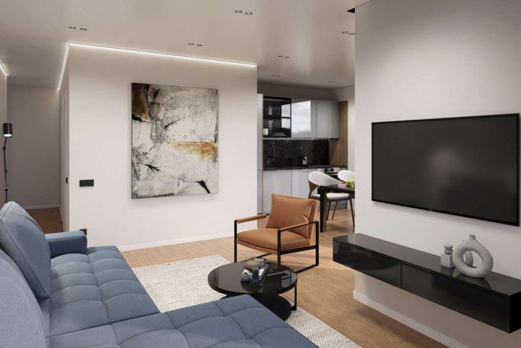 Este estudio se plantea como un espacio abierto en el que salón, cocina y zona de descanso comparten ambiente de forma natural, acompañado de un baño independiente y una pequeña terraza que aporta ventilación y salida exterior.