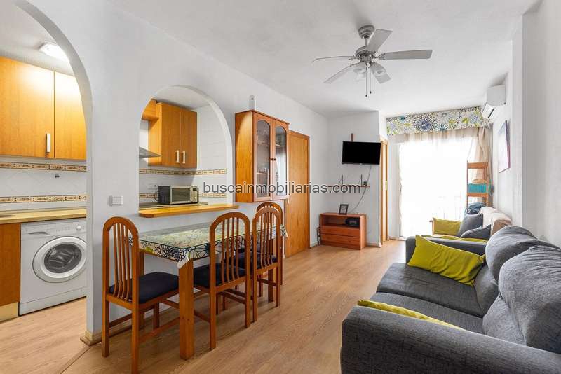 Al entrar, encontramos un acogedor salón-comedor con aire acondicionado y ventilador de techo, que garantiza confort durante todo el año. El mobiliario combina tonos neutros con toques de color, creando un ambiente cálido y actual. Desde el salón se accede a la cocina de estilo abierto, recientemente reformada, equipada con muebles en tono madera, encimera práctica y todos los electrodomésticos, incluyendo lavadora y microondas, con barra americana para mayor funcionalidad.
