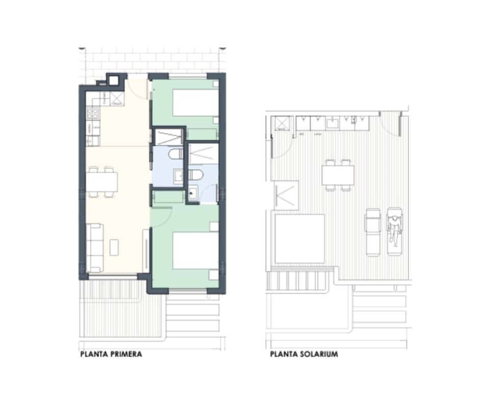 Cada vivienda está diseñada con especial atención a los detalles, incluyendo dos dormitorios y superficies que varían entre 101 m² y 110 m². Equipadas con calefacción mediante preinstalación de aire acondicionado y un sistema de aerotermia para el agua caliente, estas propiedades garantizan un ambiente confortable durante todo el año. Las ventanas de aluminio con rotura de puente térmico aseguran la eficiencia energética y el aislamiento. La cocina, equipada y de tipo americana, se integra a la perfección con las áreas comunes, ofreciendo un espacio acogedor y versátil.