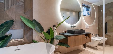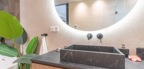 La villa ofrece dos dormitorios dobles de gran tamaño, perfectamente diseñados para maximizar la comodidad y el descanso. Además, dispone de dos baños completos y un aseo adicional, todos equipados con materiales de primera calidad y un diseño contemporáneo que destaca por su funcionalidad y estética. La cocina está completamente equipada, con una elegante encimera de granito marmoleado y una práctica isla central que brinda espacio adicional para cocinar y socializar. La carpintería interior lacada en blanco, los suelos de gres porcelánico y la carpintería exterior de aluminio con doble acristalamiento aseguran un excelente aislamiento térmico y acústico, creando un ambiente cálido y tranquilo.