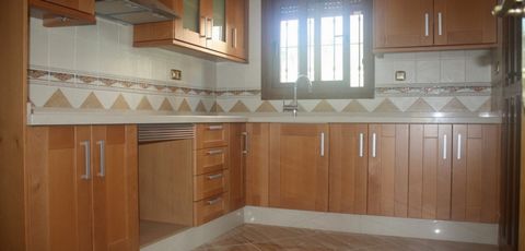 Villa de estilo mediterráneo con 3 dormitorios, 4 baños, salón con chimenea, gran cocina, terraza, garaje doble, jardín privado con piscina y plaza de aparcamiento.