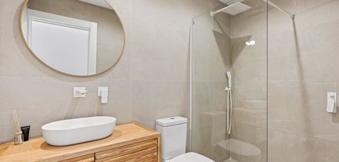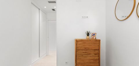 La vivienda cuenta con tres amplios dormitorios y dos baños modernos y elegantes, ambos con persianas eléctricas para mayor comodidad. El salón también dispone de persianas eléctricas, proporcionando privacidad con solo pulsar un botón.