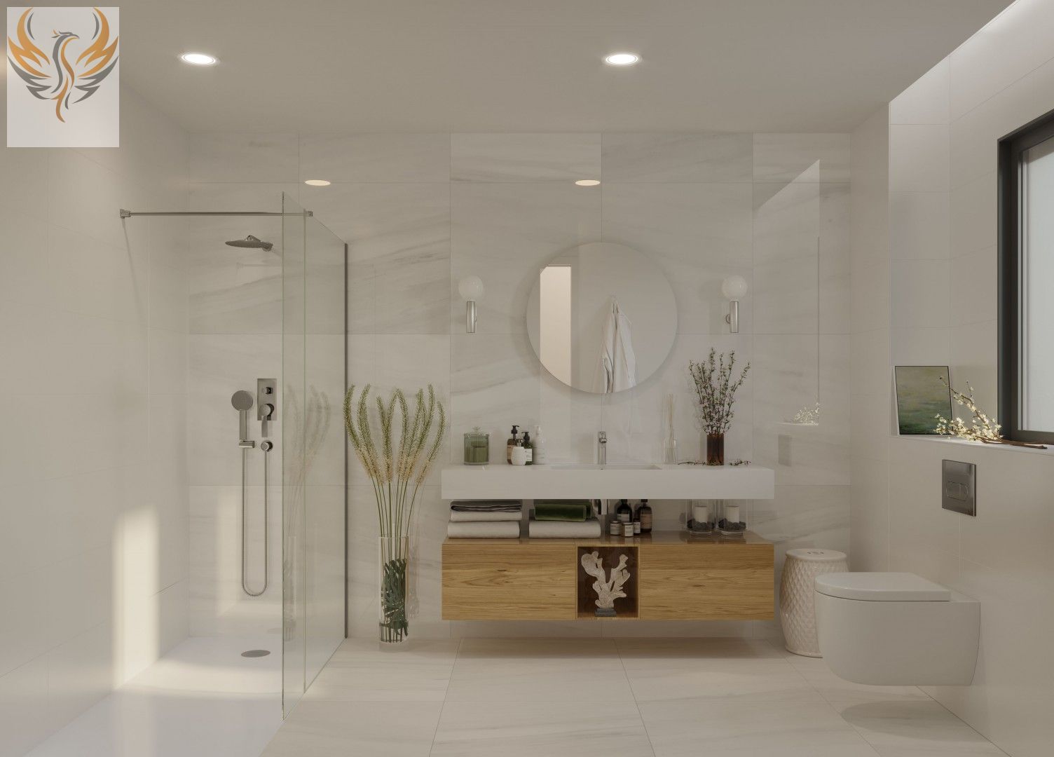 Gres porcelánico de primera calidad en baños, con diferentes combinaciones en función del baño. En balcones y