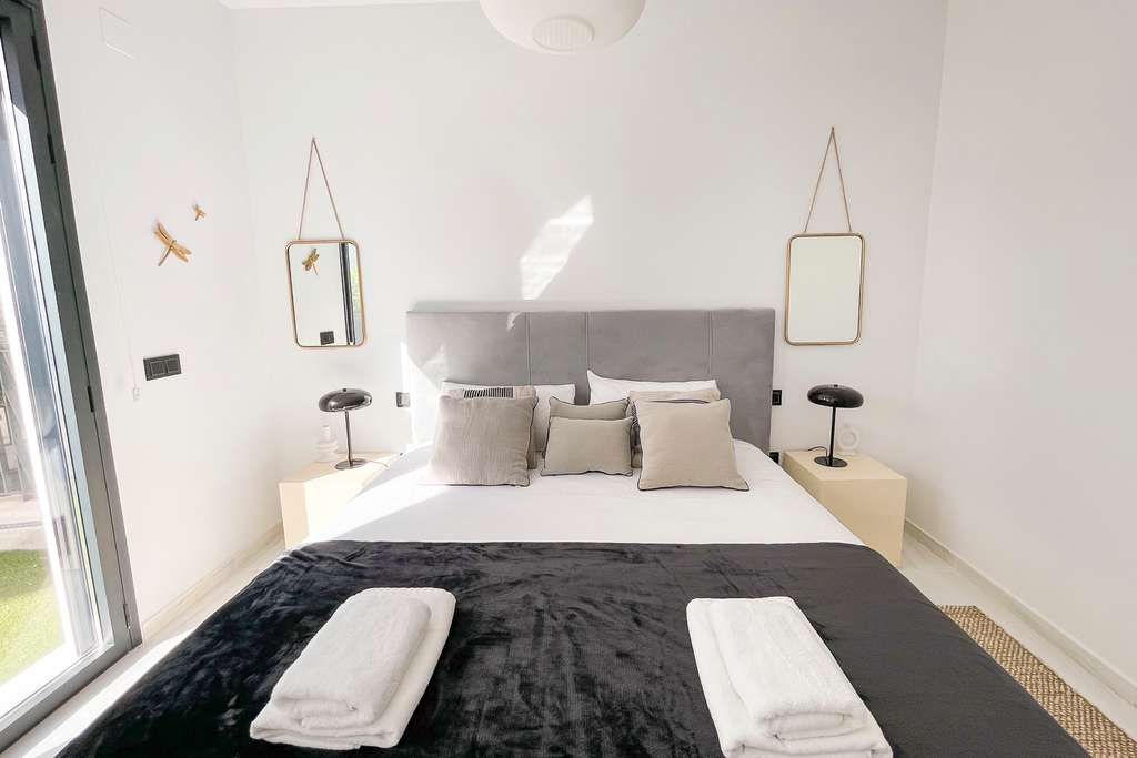 El apartamento está completamente amueblado y equipado para la comodidad, incluyendo aire acondicionado, ventiladores de techo y armarios empotrados. La distribución es funcional, asegurando mucha luz natural y un uso eficiente del espacio.